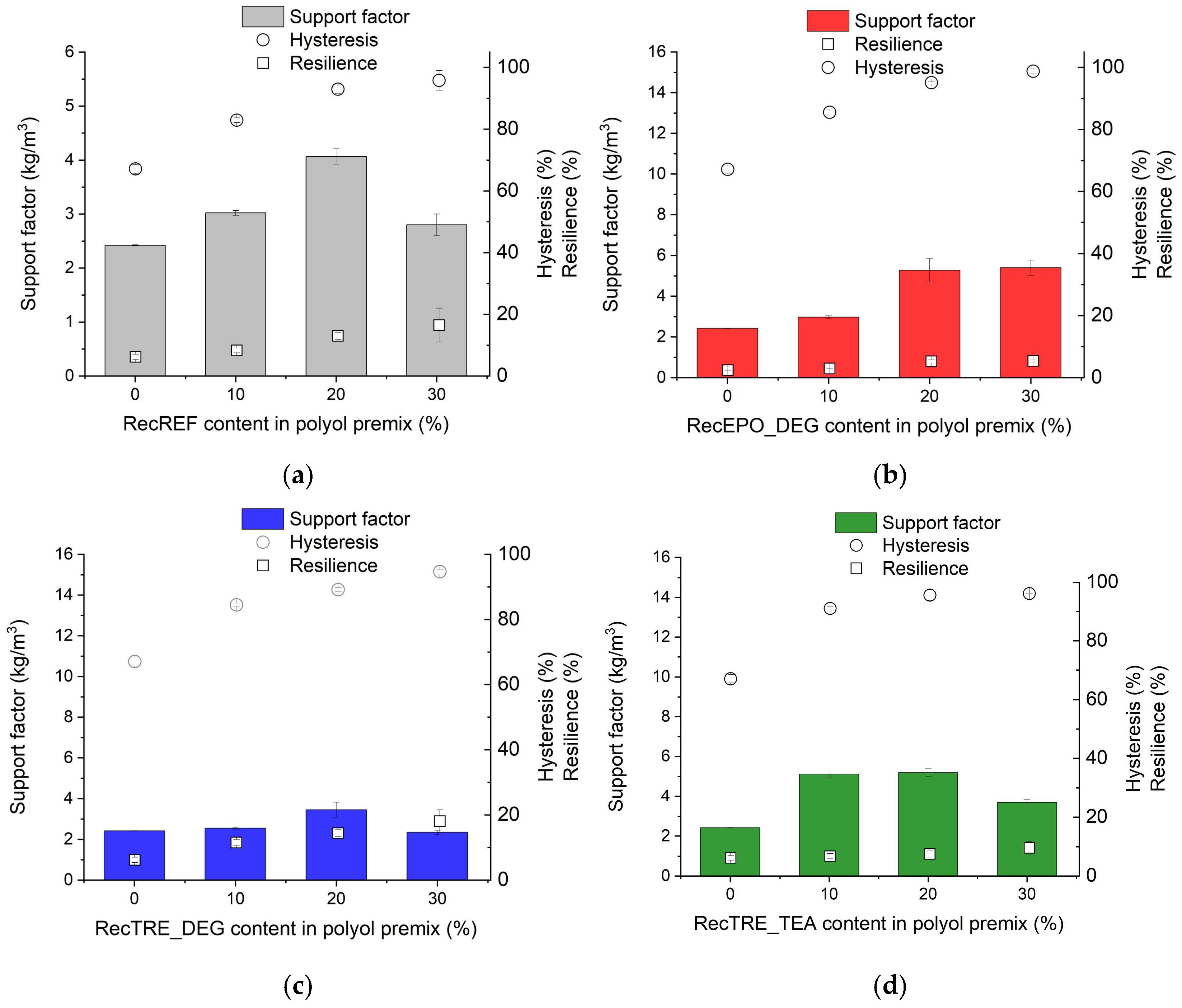 Figure 11). A deviation from this relationship is characteristic of the VPU/RecTRE_TEA_20 foam, which is characterized by the highest comfort factor among the VPU/RecTRE_TEA foams. All modified viscoelastic polyurethane foams are characterized by a higher comfort factor and hysteresis than the unmodified reference foam, for which these values were 2.4% and 67%, respectively. Increasing the mass fraction of repolyol in viscoelastic foams also increases their ability to absorb energy (hysteresis) and elastic rebound (resilience). The resilience value most similar to the reference foam is found for VPU/RecEPO_DEG_10, VPU/RecTRE_TEA_10 and VPU/RecTRE_TEA_20. It should be noted, however, that all obtained foams have a resilience below 20%, which, despite the increase in this parameter, still indicates the ability to absorb energy.
