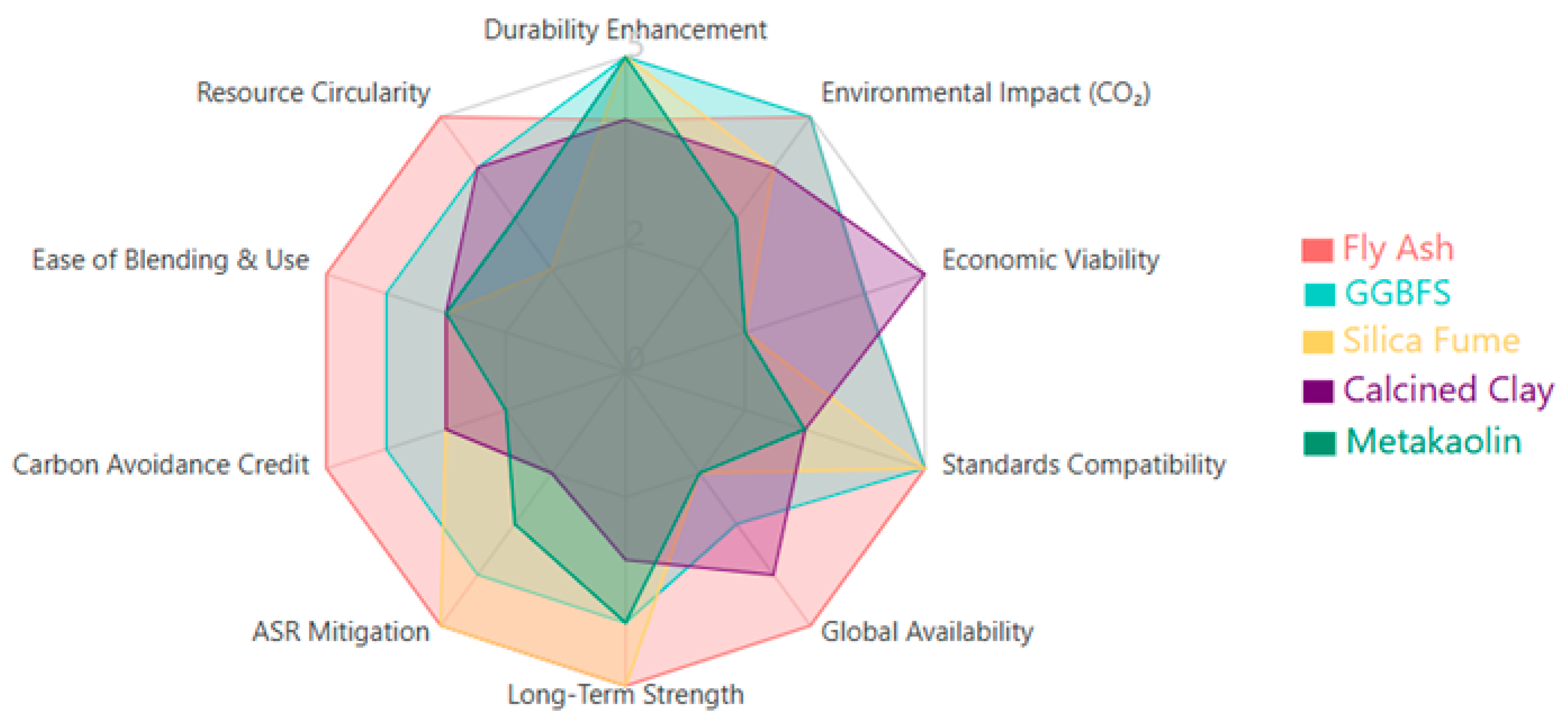 SCMDurability EnhancementEnvironmental Impact (CO2 Saving)Economic ViabilityStandards CompatibilityGlobal AvailabilityLong-Term Strength Gain ASR Mitigation PotentialCarbon Avoidance CreditEase of Blending & UseResource Circularity ImpactReferences