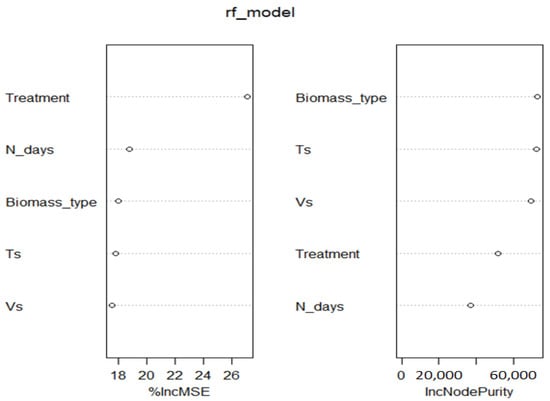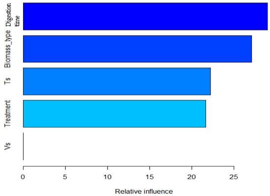 To address these limitations, ensemble ML methods were applied. The first model is Random Forest Regression and explained 79.49% of variance with RMSE = 15.7, confirming its ability to generalize well (Figure 8). Analysis of importance analysis showed treatment as the most influential predictor, followed by digestion time, Ts, and biomass type. The second model, GBM, further improved performance, achieving the lowest RMSE and ranking digestion time, Ts, biomass type, and treatment as the most critical predictors (Figure 9). The results reflect GBM’s capacity to prioritize non-linear and interaction effects. This mirrors the work of Deval et al. (2024) [], who also showed that ensemble methods like GBM outperform simpler models in forecasting biogas production from complex feedstocks. Table 3 compares the three approaches, showing GBM’s clear superiority over RFR, LM.