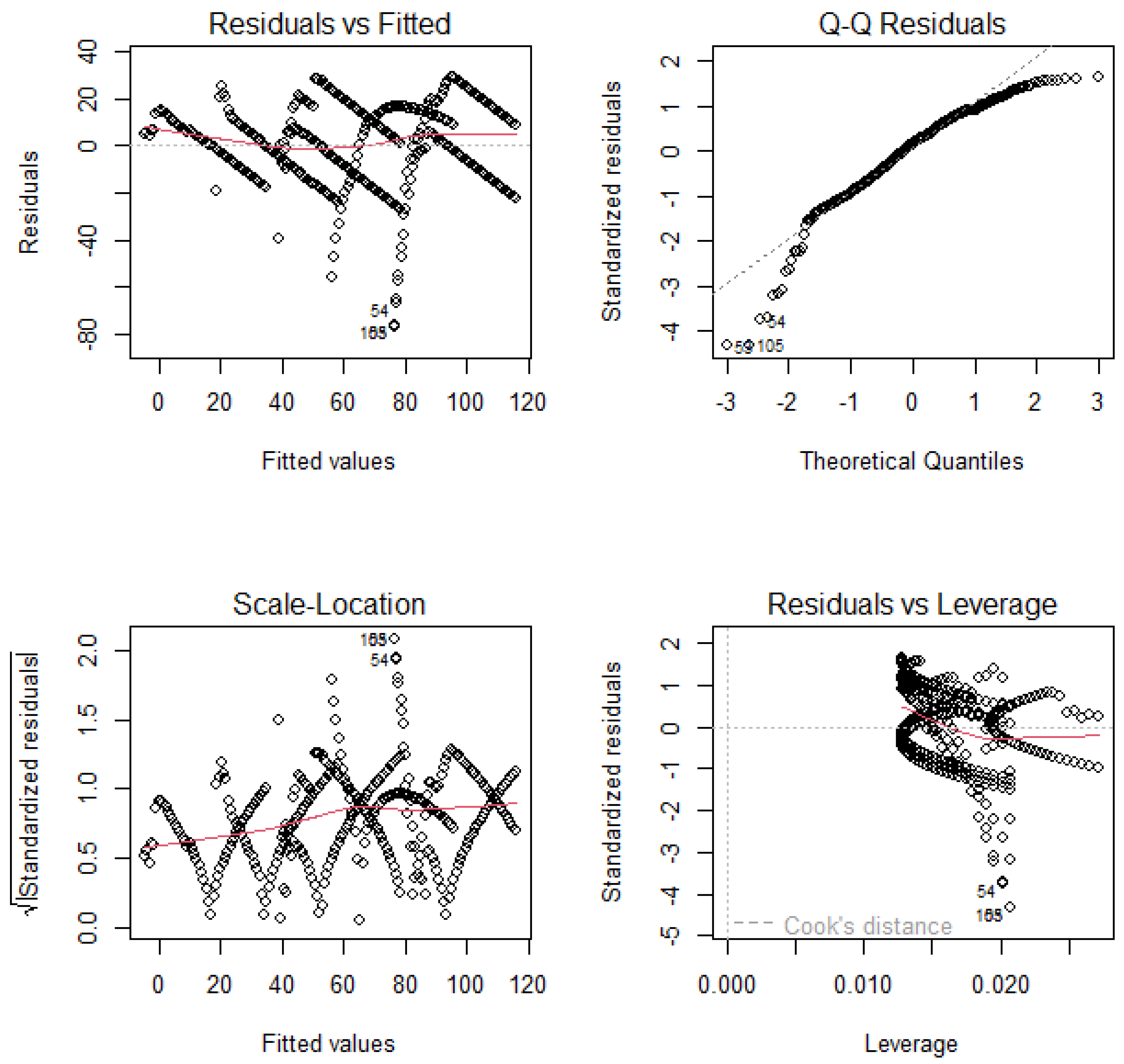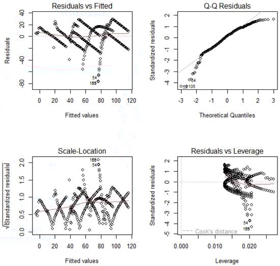 A detailed examination of the regression diagnostics for both Model 1 and Model 2 (Figure 7 and Figure 8) confirmed these violations. The residuals vs. fitted plot showed a distinct non-random, funnel-shaped pattern, indicating heteroscedasticity and suggesting a systematic error in the model’s predictions across the range of fitted values. The normal Q–Q plot revealed significant deviations of the standardized residuals from the theoretical diagonal line, confirming the non-normality of the error distribution. Furthermore, the scale–location plot reinforced the evidence of heteroscedasticity by showing a clear trend in the spread of residuals. Finally, the residuals vs. leverage plot identified several data points with high leverage, indicating influential observations that disproportionately affected the model’s parameters. The collective failure of these diagnostic tests to meet the core assumptions of linear regression unequivocally justifies the employment of more flexible ensemble machine learning methods, which are robust to such violations.