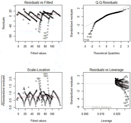 In addition, an extended model with interaction terms between treatment and biomass type provided a significantly better fit with an adjusted R2 equal to 79%, capturing combined effects overlooked in the baseline model (Figure 6). ANOVA confirmed this improvement, reducing residual error from 113,859 to 86,619. However, diagnostic checks revealed key assumption violations in terms of non-linearity and heteroscedasticity, non-normal residuals, and influential observations.