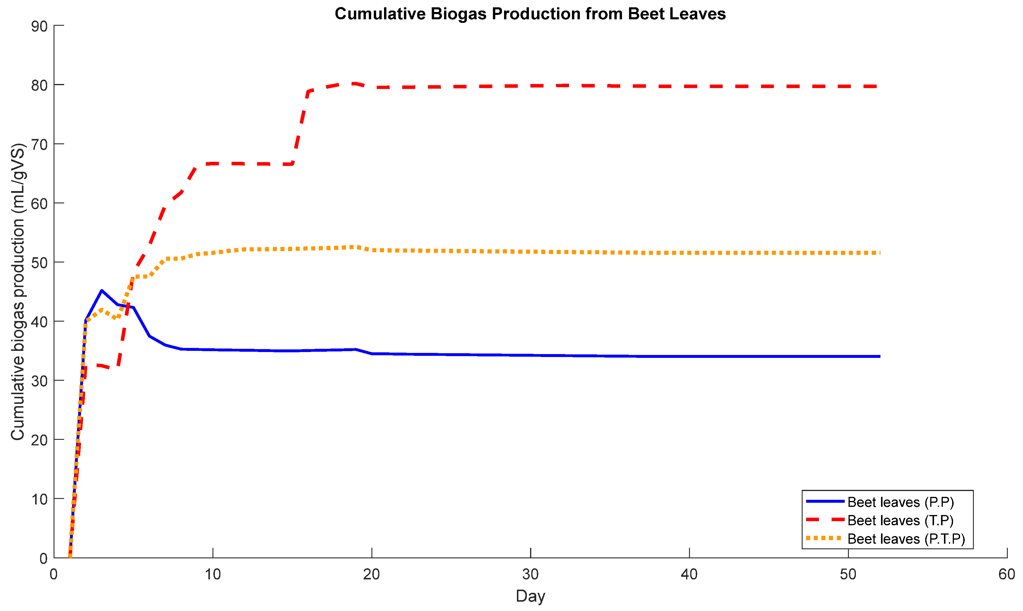 BMP (Biochemical Methane Potential) test of beet waste with different pretreatment: PTP, TP, and PP.