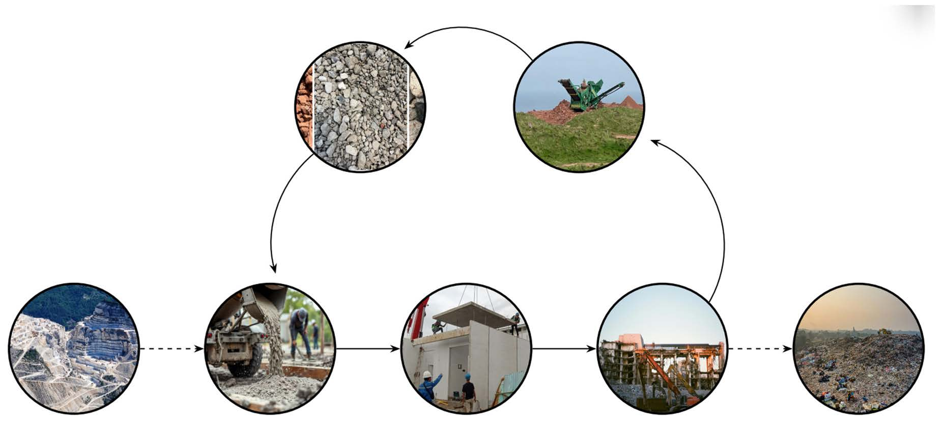 The general population, the scientific community, and governments, more specifically the European Commission have expressed great concern in the rising production of construction waste. In fact, the European Commission, has emphasized in its latest report in 2025 that circularity is set to become a central priority for maximizing the EU’s scarce resources, reducing external dependencies, and strengthening resilience [11]. In the context of concrete, material circularity can be achieved by using RCA, which is crushed processed concrete rubble obtained from demolition activities, and using it back into new concrete, replacing natural stone aggregates. Many studies [12,13,14,15,16,17] have evaluated the use of RCA in concrete for decades; as a consequence, many standardized norms for the proper use and the allowable replacement ratio of RCA in concrete have been developed [18]. The broad use of this material comes with many industry challenges, for example, the poor connection between stakeholders, lack of awareness about the potential benefits, lack of circular design guidelines, material cost, and variability of the recycled material [19]. However, many experimental studies indicate that concrete made with recycled aggregates can match, or in some cases surpass, the mechanical performance of concrete produced with virgin aggregates, while also lowering the carbon footprint of new concretes and supporting the attainment of sustainability certifications [20].