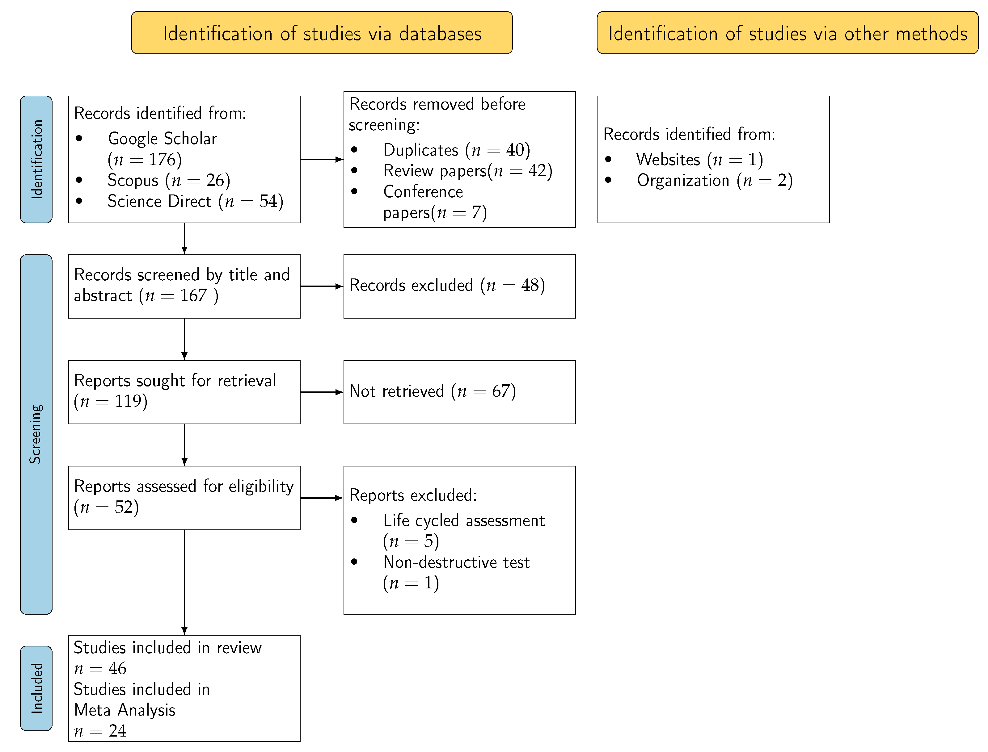 The remaining studies underwent full-text assessment based on methodological transparency and material source accuracy. Papers were excluded if they contained insufficient experimental data to support quantitative analysis, presented ambiguity in the origins or composition of the recycled concrete aggregates, or addressed topics outside the defined scope, such as life-cycle assessment (LCA) or modeling studies without laboratory experimentation. After this stage, 24 experimental investigations satisfied all inclusion criteria and were thoroughly evaluated for the meta-analysis. For consistency across studies, only the data corresponding to the highest RCA replacement level in each experiment were extracted and analyzed. The complete meta-analysis and data synthesis are presented in this research and can be seen in the supplementary materials.