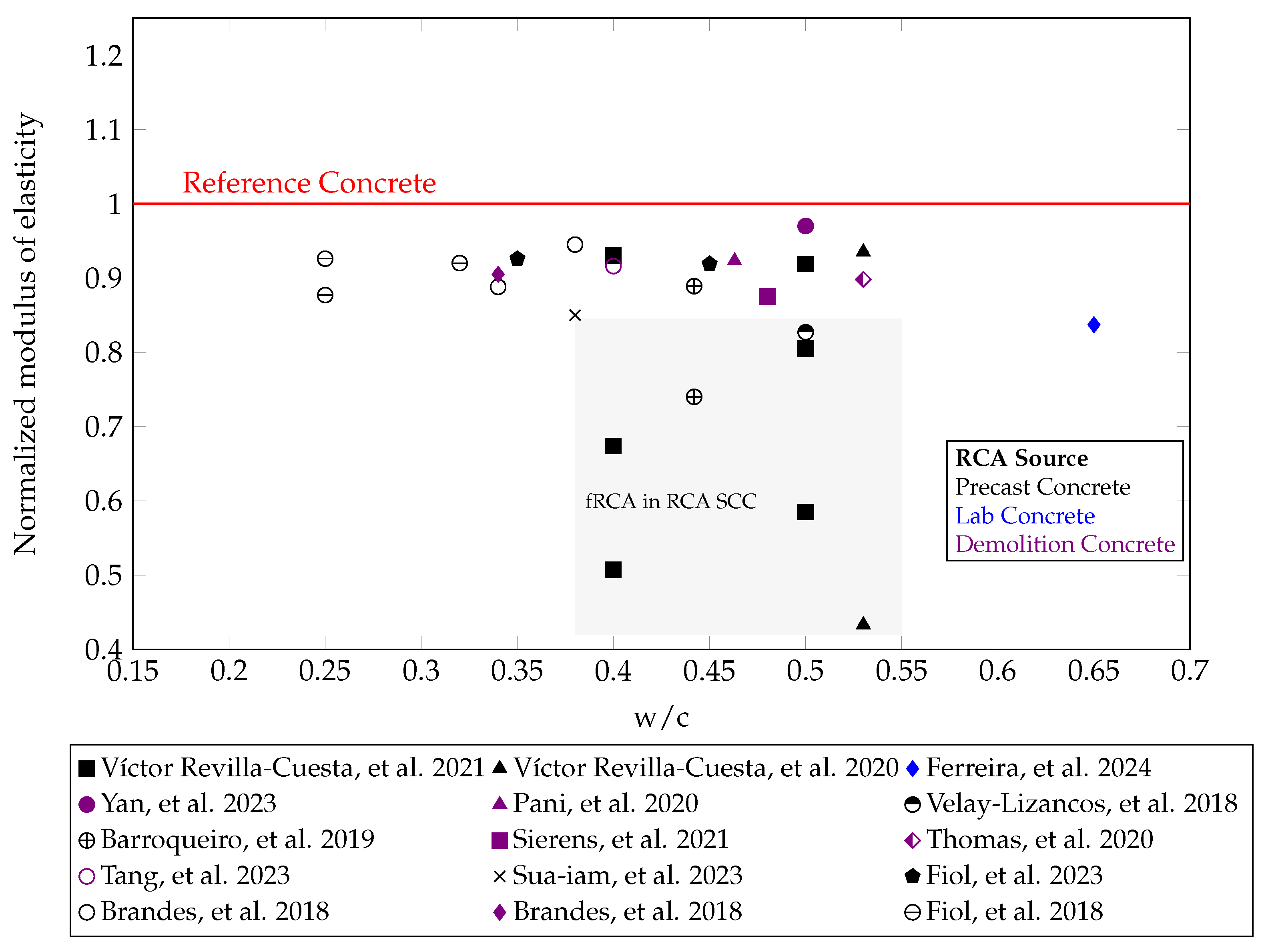 At the same time, 66.6 % of the reviewed studies also reported the modulus of elasticity (MOE) of their recycled concrete mixtures. Figure 6 presents the normalized modulus of elasticity as a function of the ratio of water-to-cement. As with the compressive strength results, the modulus of elasticity values were normalized to their respective reference concretes to allow for more meaningful comparisons. In this case, none of the RCA-SCC mixtures exhibited higher stiffness than the corresponding reference concrete. This is due to a weaker bond between the old adhered mortar and the new mortar in the concrete [61]. In Figure 6, a subset of data highlighted within a gray rectangle can also be seen. This data subset corresponds to the seven mixes that incorporated fine RCA in varying proportions in the recycled concrete. Since the modulus of elasticity is highly influenced by the quality of the bond between the cement paste and the aggregates [62,63], these concretes show significantly lower stiffness compared to studies that evaluated only coarse RCA. Unlike compressive strength, the relationship between the source of RCA and the modulus of elasticity is less evident. However, the use of fine RCA draws a consistent trend in the reduction in stiffness compared to the reference concrete, regardless of the water-to-cement ratio.