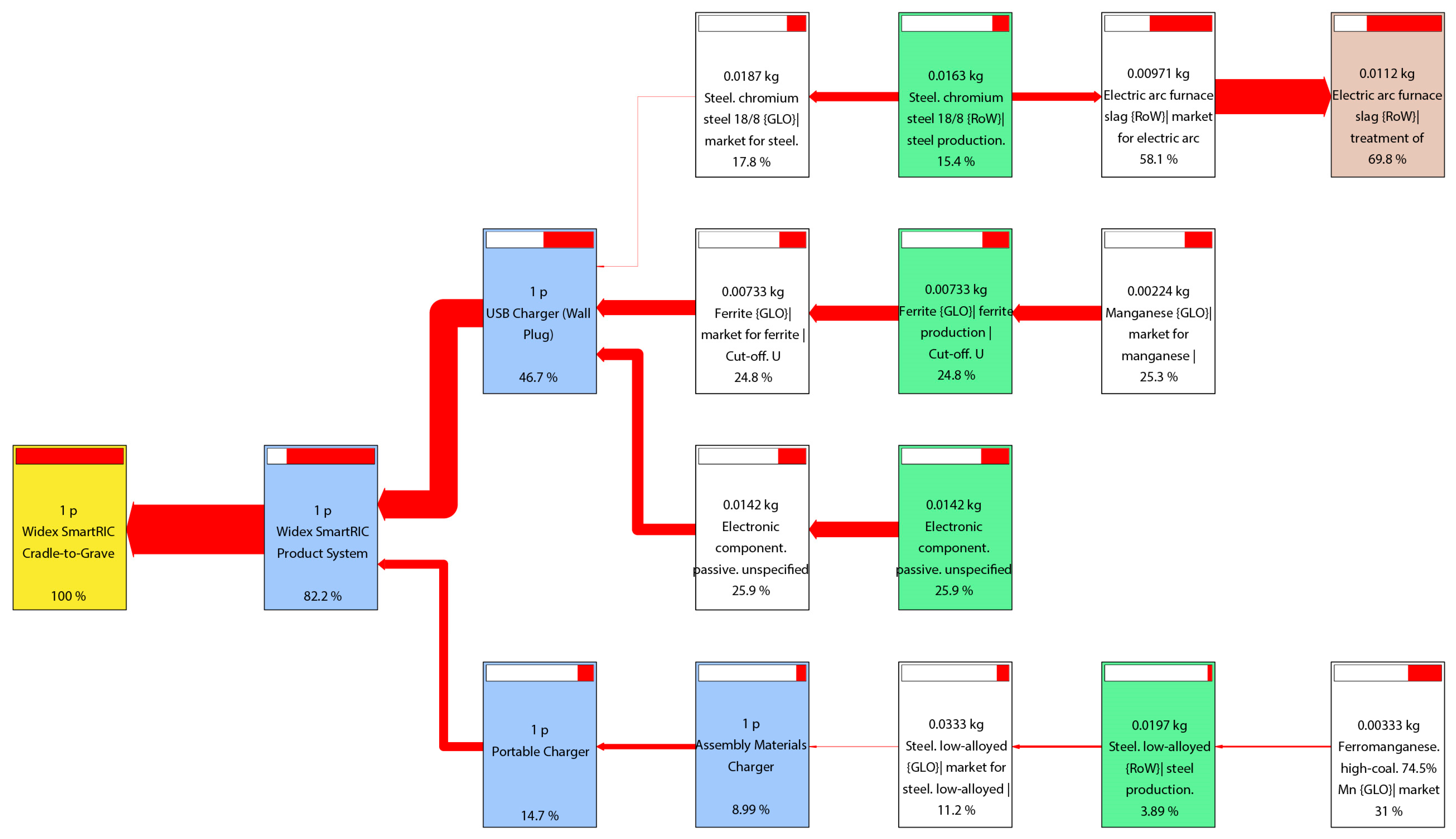 Figure 3), the USB charger remains the most impactful sub-assembly, responsible for nearly half of the total product system contribution (46.7%). This is largely driven by electronic component production (≈26%) and ferrite core manufacturing (≈25%), which are strongly tied to manganese mining and ferromanganese production, particularly coal-intensive smelting routes (≈31% at the sub-process level). These inputs link directly to the slag and ash waste streams identified as hotspots in the overall results. Furthermore, the production of passive electronic components (e.g., resistors, capacitors, inductors) adds further burdens due to the complexity and intensity of mineral extraction and metallurgical refining.