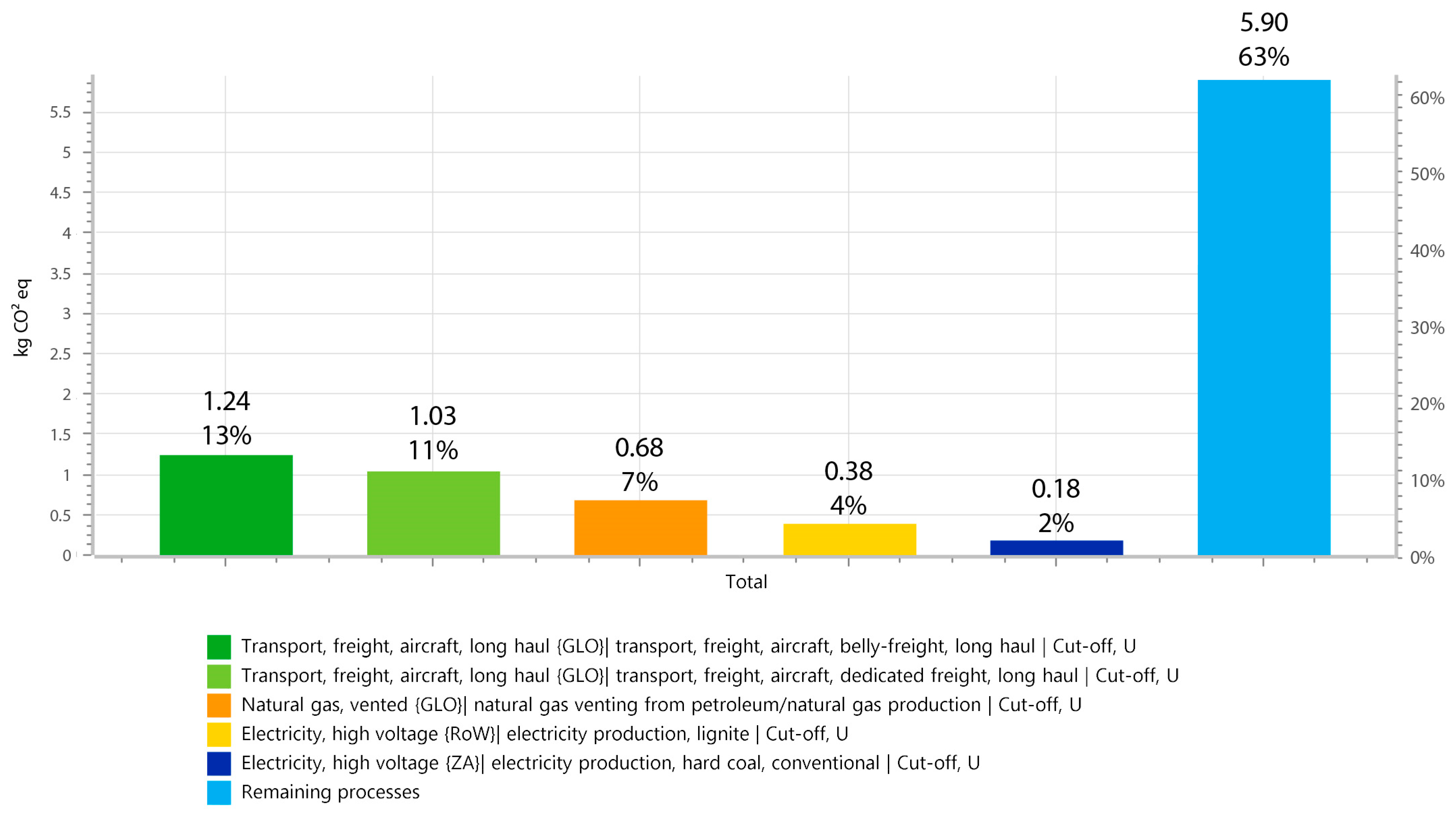 2 eq (63%). The largest single hotspots are long-haul air freight processes at 1.24 kg CO