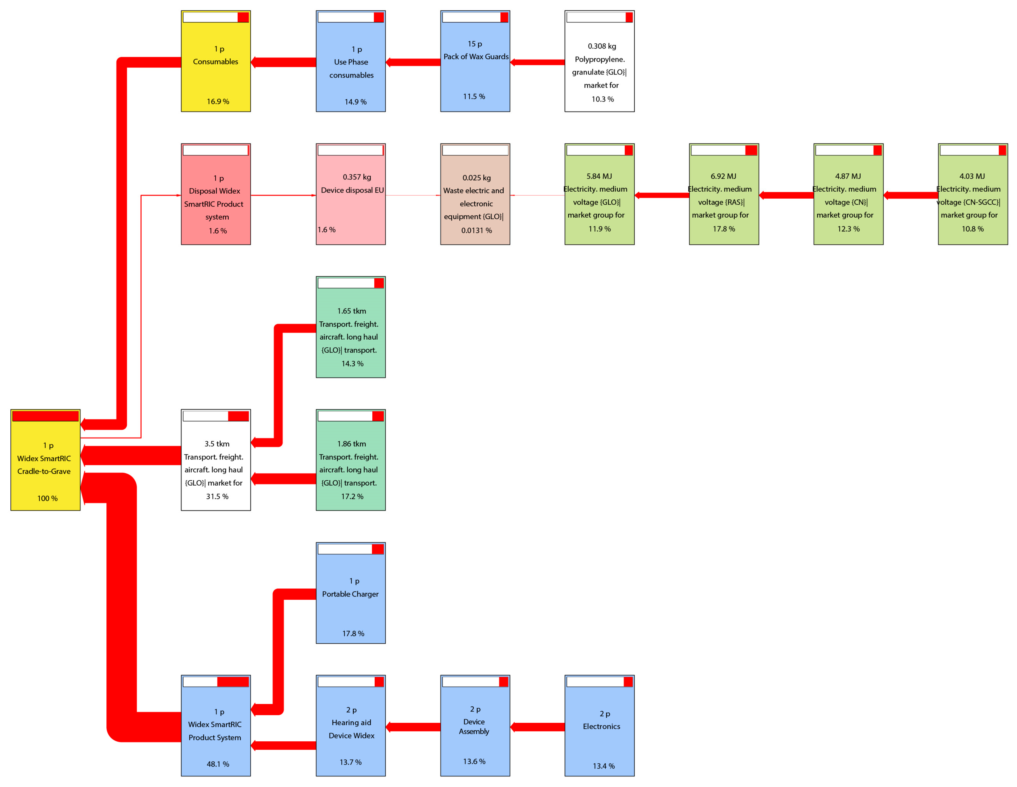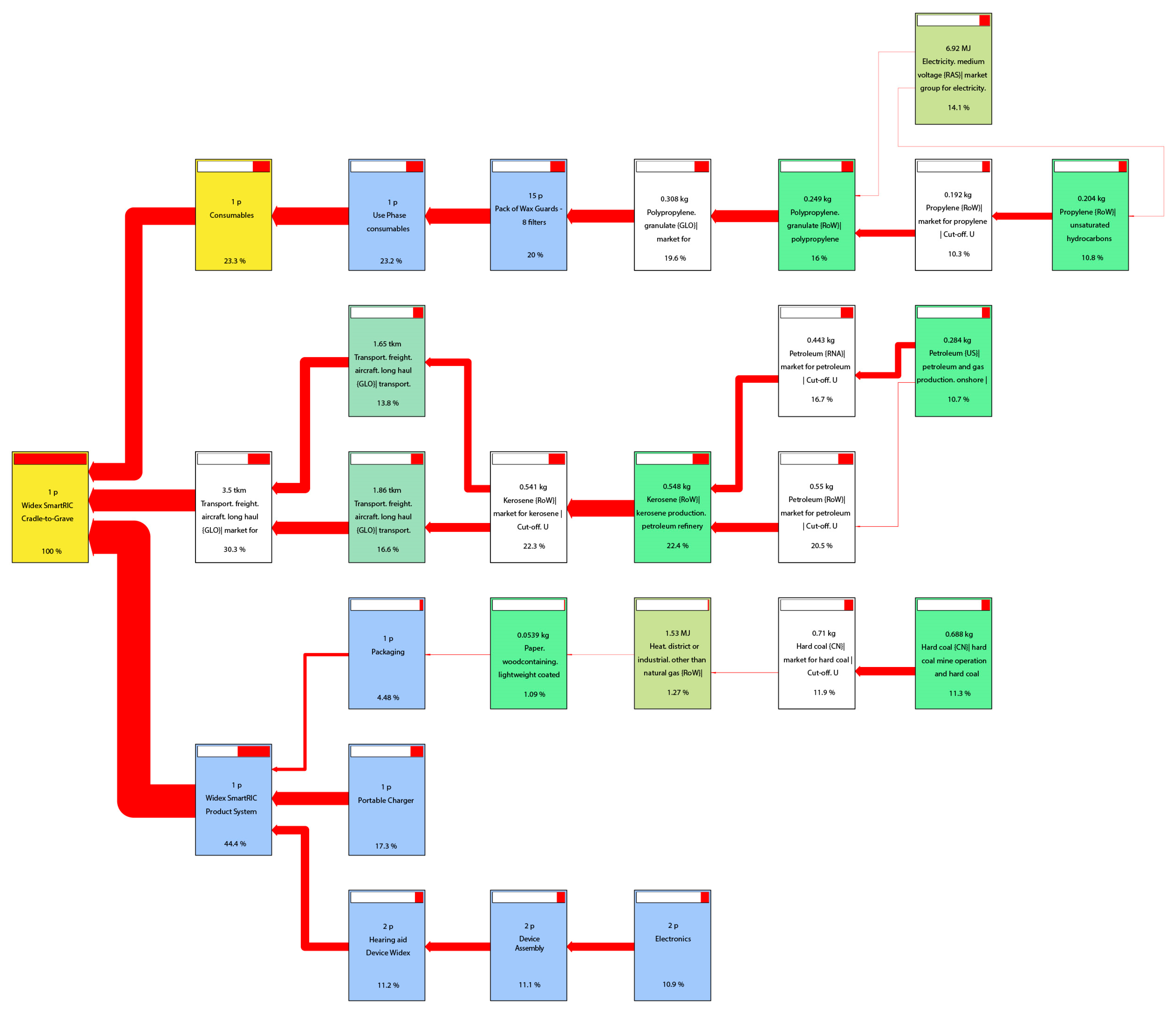Considering the assumptions, the LCA aims to comprehensively encompass the whole life cycle of hearing aids, using precise foreground data and a broad set of impact categories. This comprehensive approach establishes the base to determine the hotspots in the life cycle and so indicates where improvement opportunities should be focused.