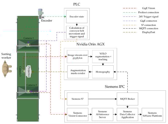 In this setup, all computer vision tasks, including image acquisition via GigE Vision using the pypylon library [14], You Only Look Once (YOLO) segmentation [15] and tracking, homography transformation, and augmentation mask rendering, are executed directly on the NVIDIA Jetson AGX Orin 64 GB (NVIDIA Corporation, Santa Clara, CA, USA) (see Figure 3). A single camera positioned above the sorting worker is used for tracking and classification tasks. Homography transformation is a mathematical technique in computer vision used to map points between two planes. It is particularly useful for correcting perspective distortions or aligning images from different viewpoints [16]. In the context of the recAIcle system, homography transformation is used to accurately overlay masks, calculated from camera images, and project them onto waste objects on the conveyor belt, even as their orientation or position changes. The augmentation masks are rendered and transmitted via DisplayPort to the projector, offering real-time visual guidance to the sorting worker. This variant minimises latency and hardware complexity.