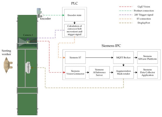 In this configuration, image acquisition from the GigE Vision camera is routed directly to the Siemens IPC (see Figure 5). The Siemens AI Inference Server processes detections and the IPC also handles the rendering of the augmentation mask and the homography transformation. Although this configuration may introduce higher inference latency, it allows seamless integration into existing Siemens automation and analytics ecosystems. Object tracking is realised using data from the encoder. The augmentation masks are adjusted based on the time between projected frames and the distance measured by the encoder. This adjustment ensures that the movement of the augmentation masks is synchronised with the speed of the conveyor belt and, therefore, with the speed of the waste objects. These masks are projected for a fixed amount of time. While this synchronisation ensures alignment with the conveyor belt speed, a key limitation is that the mask remains projected even after the sorting worker removes the augmented object. However, the encoder-based system represents the most cost-effective variation. This configuration requires only a single camera to capture the waste stream before it enters the sorting cabin, making it a cost-effective solution for simpler setups.
