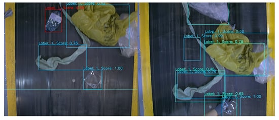 Qualitatively, the system demonstrated adaptability to subtle operator-specific sorting criteria that were not explicitly part of the original training set. This highlights the system’s capability to evolve toward alignment with the operational priorities and implicit decision rules applied by experienced sorting workers. An example of this binary classification process is illustrated in Figure 6, where waste objects on the conveyor belt are shown before and after manual sorting. Bounding boxes, which delineate the detected object, are used to characterise the area in which each object is located. The red bounding box marks an object that was sorted out and is no longer visible in the post-sorting image. This removed object was subsequently assigned to the material class or target fraction, such as Polyethylene Terephthalate (PET). The proposed framework offers a scalable and adaptable solution for improving material-specific recognition accuracy in recycling applications by integrating active learning, precise synchronisation, and advanced vision systems. The continuous feedback loop ensures that the system evolves in response to operational needs, aligning with the priorities of experienced sorting workers while maintaining compliance with industrial automation standards.