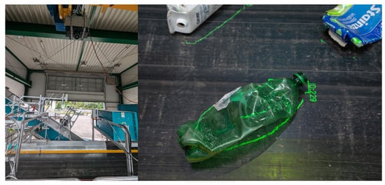 In order to support and interact with sorting workers, a human–machine interface (HMI) is required to bridge the recAIcle system and the sorting workers. The augmentation system visually indicates whether an object should be sorted out by displaying different coloured borders around the waste objects. The objects are highlighted using a high-intensity projector (Optoma ZU820T) (Optoma Corporation, Hemel Hempstead, UK) mounted vertically above the sorting belt (see Figure 7, left). The projected markings follow the objects in real time, as shown in Figure 7 (right). The results focus on the Standalone Orin AGX Configuration. The projected markings follow the objects in real time.