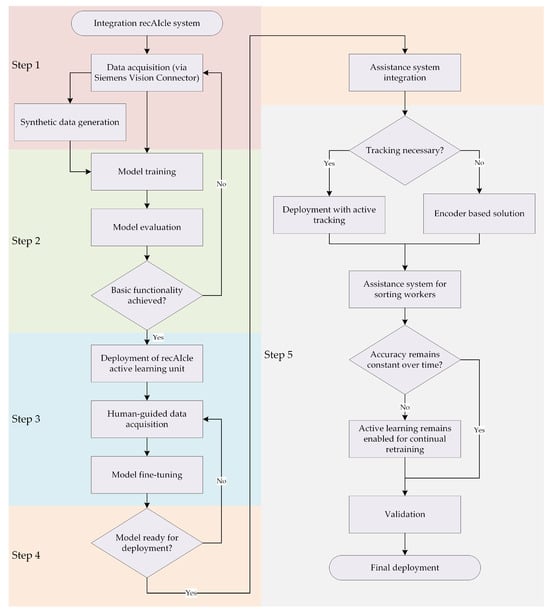 The first step in any deployment is data acquisition for the selected material stream, which can be supplemented by synthetic data generation. In the second step, different models are trained, tested, and evaluated until they achieve a basic level of functionality. This workflow was demonstrated in an experiment with steel scrap from an incineration treatment plant with copper-contaminated objects. Once this functionality is established (Step 3), the active learning unit is deployed, allowing the basic model to be improved by observing the actions of expert sorting workers. Over time, the model’s performance is periodically evaluated. When an acceptable level of accuracy is reached (Step 4), the assistance system is deployed.