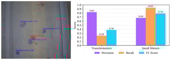 Figure 9 summarises the quantitative evaluation for the two object classes. The model achieved a high precision of 0.82 for transformers, but recall was limited to 0.24, resulting in a modest F1 score of 0.38. In contrast, small motors were detected with a recall of 0.93 and a precision of 0.68, leading to an F1 score of 0.79. These results indicate that while the model can successfully generalise to certain object types, performance varies strongly by category. In particular, transformer detection suffers from a high false-negative rate, whereas small motors can be identified with comparatively high reliability.