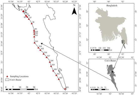 A total of 23 stations were selected along the ~100 km Cox’s Bazar–Teknaf coastline to ensure coverage of areas with varying human activities (Figure 1). Based on field observations during sampling, the stations were grouped into three functional zones to facilitate comparative analysis: