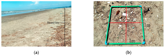 During low tide in October 2024, surface sediment samples were collected, mainly from the most recent visible strandline. In 2–3 stations where the strandline was absent due to narrow beach width or post-tidal washout, samples were taken from the vegetation line, which marked the furthest tidal reach. Microplastics (<5 mm, particularly the larger fraction ~1–5 mm) and mesoplastics (5 mm–2.5 cm) were collected using a stainless-steel sieve with mesh sizes of 710 µm and 5.6 mm, respectively, while macroplastics (>2.5 cm) were collected directly within the 1 m × 1 m quadrat (Figure 2). Sampling and handling procedures followed the National Oceanic and Atmospheric Administration (NOAA) guidelines [53]. All topsoil was sieved, and the collected debris was stored in airtight zipper bags and transported to the Bangladesh Oceanographic Research Institute (BORI) laboratory for further analysis.