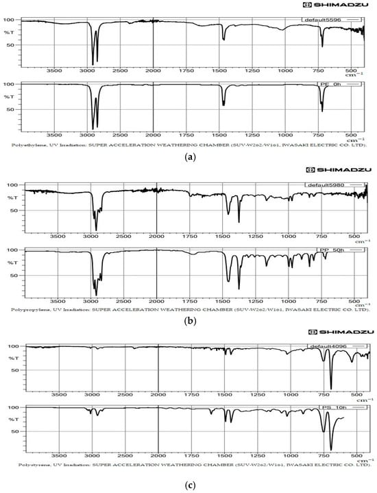 Plastic particles were analyzed using FTIR to determine their polymer composition and corresponding functional groups. Polymer types were identified using a Fourier Transform Infrared Spectrometer (FT-IR, LabSolutions IR, Shimadzu Corporation, Kyoto, Japan) equipped with an ATR diamond crystal. Infrared absorption spectra were controlled over 4000–400 cm−1, averaging 40 scans at a resolution of 4 cm−1 (Figure 3). The obtained spectra were matched against a polymer reference library to determine the types of microplastics present [39,55]. A similarity index exceeding 80% between the sample spectra and reference spectra was used as the identification threshold [46].