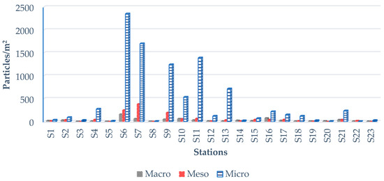 Abundance of macro-, meso-, and microplastics in beach sediment samples in Cox’s Bazar. From S1 to S23, each station represents the total number of plastics in particles/m2. Station S6 recorded the highest number of MPs, while stations S6–S13 exhibited the maximum concentrations of plastic particles.