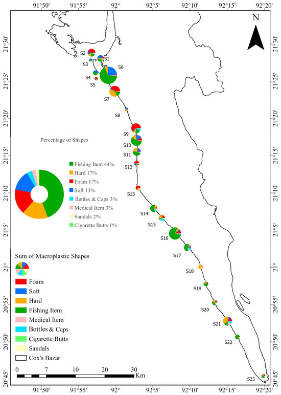 Distribution of macroplastic shapes at each station. Each station is represented by a pie chart showing shape-specific concentrations, with green indicating fishing items, the most abundant type. The central pie chart shows the overall percentage of each shape in the total macroplastic sample.