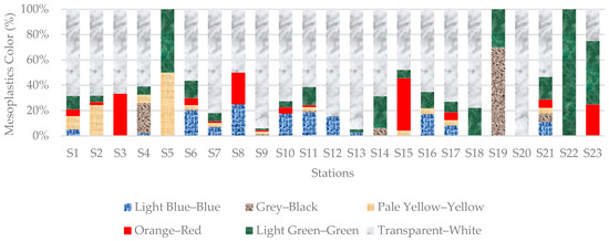 The total number of mesoplastics was 1396 particles, with an average of 60.7 particles/m2. The decreasing sequence of total mesoplastics was S7 > S6 > S9 > S11 > S10 > S17 > S4 > S15 > S16 > S21 > S2 > S13 > S22 > S1 > S18 > S14 > S12 > S19 > S8 > S23 > S3 > S5 > S20, with a range of 3–386 particles/m2. The highest number of mesoplastics was found at S7, with 386 particles/m2, while the lowest number was found at S5 and S20, with 2 particles/m2 (Figure 5).