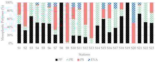 Distribution of mesoplastic polymers in sediment samples collected from all stations. PS was the dominant polymer, whereas PE and PP were present in relatively similar amounts.