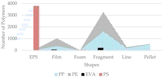 The PS number was highest in MPs due to the large number of EPS particles. All EPSs were PS-based (3788 particles) except for 12 particles found from ABS types, which are also styrene-based polymers. PP and PE were found in their highest number in fragment shapes at 1617 and 1652, respectively. In film shapes, the PE number was the most abundant (656 particles), as it represents soft plastic, especially polythene bags or food packing products. Most of the pellets represent (503 particles) PP types of polymers (Figure 13). PP was also the most abundant in the line shapes of plastics, which mainly represent ropes or fibers from fishing nets. Although the number of foams was very low, most of them represented PS (43 particles) and PU (40 particles).