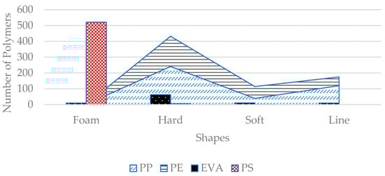 PS was also the most abundant mesoplastic due to the high number of foams found in the mesoplastics. All foams were PS-based polymer (521 particles) except for 10 particles found from EVA types and 2 particles from PP types. In mesoplastics, all EPSs were considered in the foam category. PP and PE were highest in number in the hard plastic group, at 242 and 191, respectively. In soft plastics, PE was the most abundant (75 particles), as it represents polythene bags or food packing products. PP was the most abundant in line-shaped plastics, mainly representing ropes or fibers from fishing nets (Figure 14).