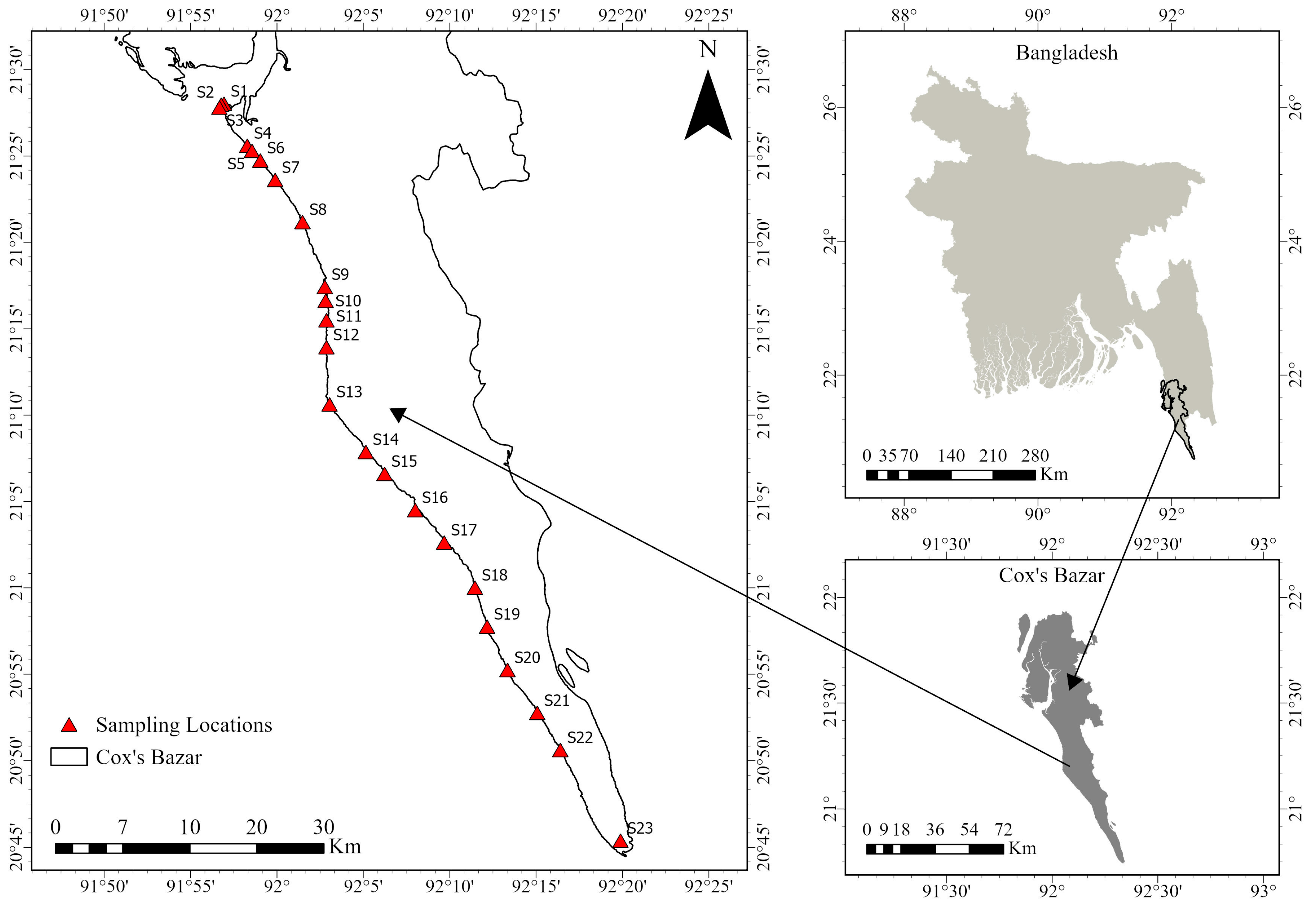 A total of 23 stations were selected along the ~100 km Cox’s Bazar–Teknaf coastline to ensure coverage of areas with varying human activities (Figure 1). Based on field observations during sampling, the stations were grouped into three functional zones to facilitate comparative analysis: