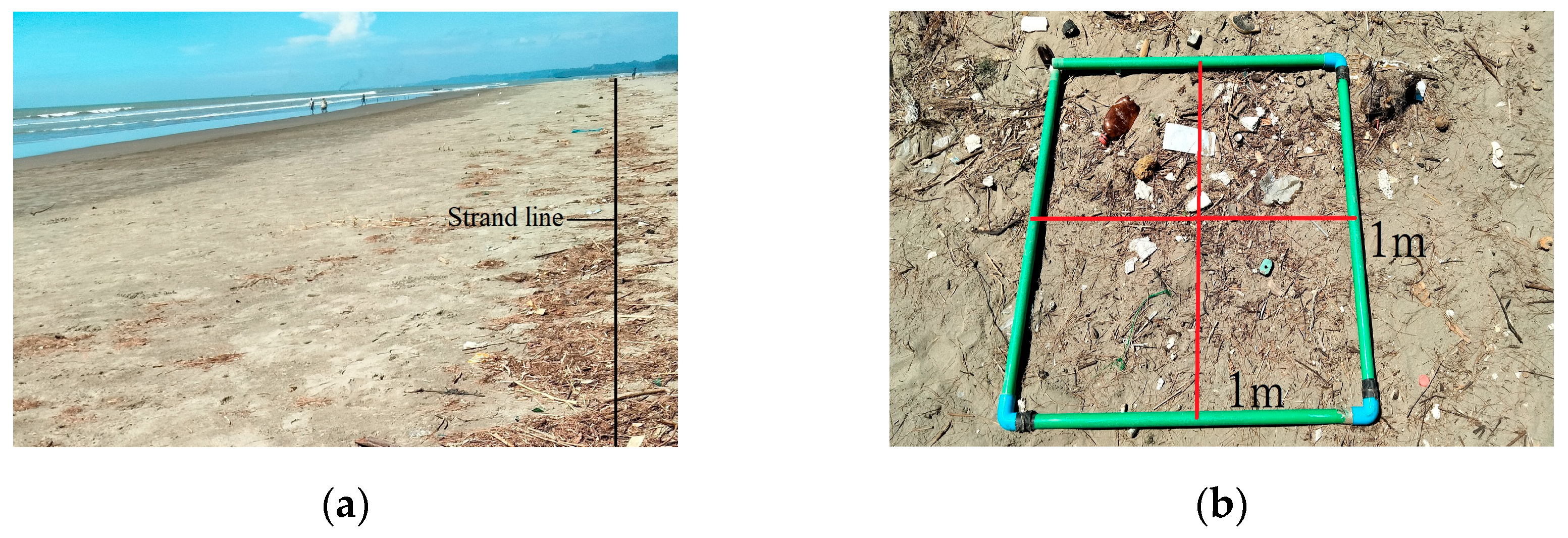 The present study consistently followed the strandline. When the beach width was narrow, the vegetation line was used instead. The sampling method was purposive sampling, and all topsoil within the quadrat was collected and sieved. This study aimed to determine the amount of macro-, meso-, and microplastics present within the same quadrat.