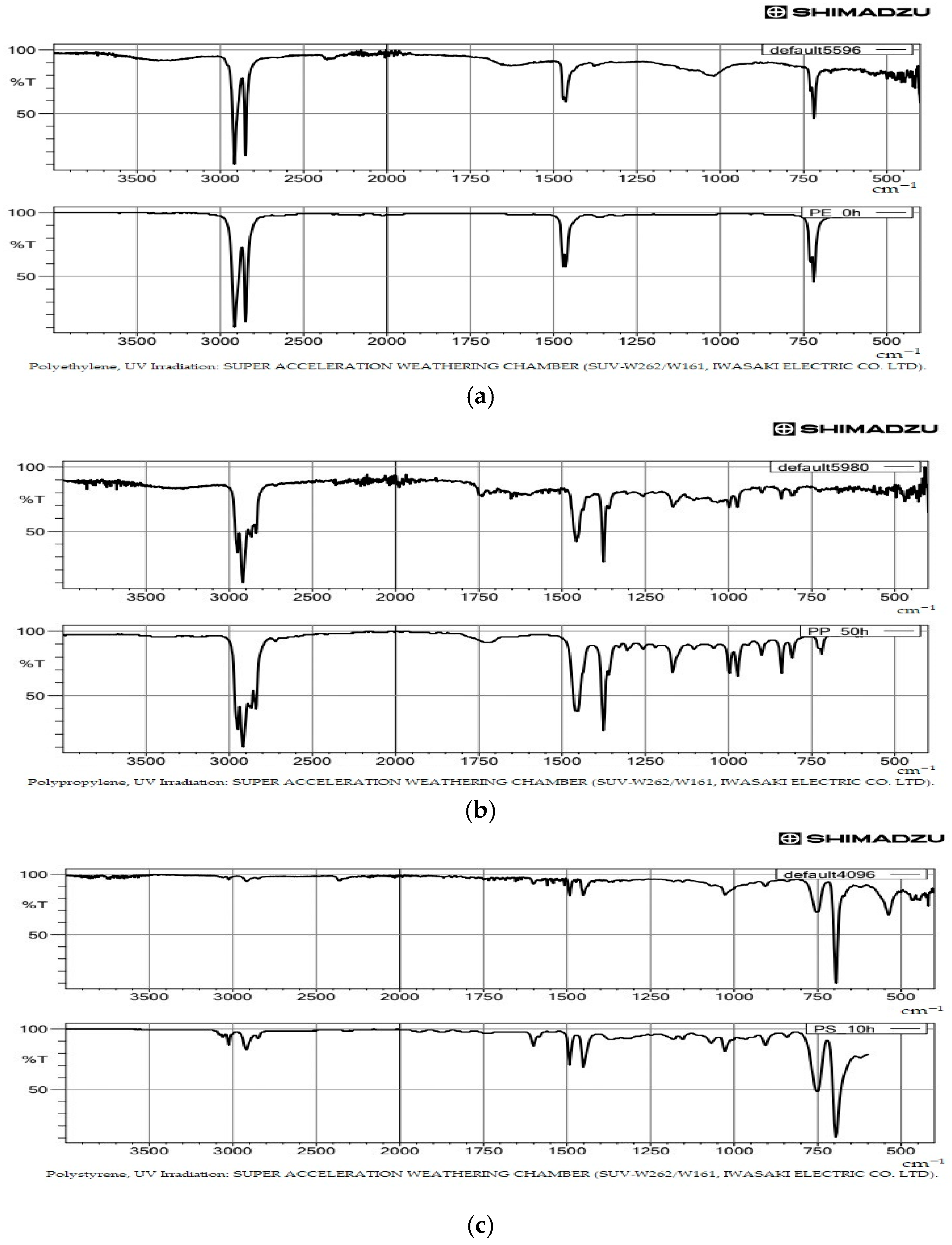 Plastic particles were analyzed using FTIR to determine their polymer composition and corresponding functional groups. Polymer types were identified using a Fourier Transform Infrared Spectrometer (FT-IR, LabSolutions IR, Shimadzu Corporation, Kyoto, Japan) equipped with an ATR diamond crystal. Infrared absorption spectra were controlled over 4000–400 cm−1, averaging 40 scans at a resolution of 4 cm−1 (Figure 3). The obtained spectra were matched against a polymer reference library to determine the types of microplastics present [39,55]. A similarity index exceeding 80% between the sample spectra and reference spectra was used as the identification threshold [46].