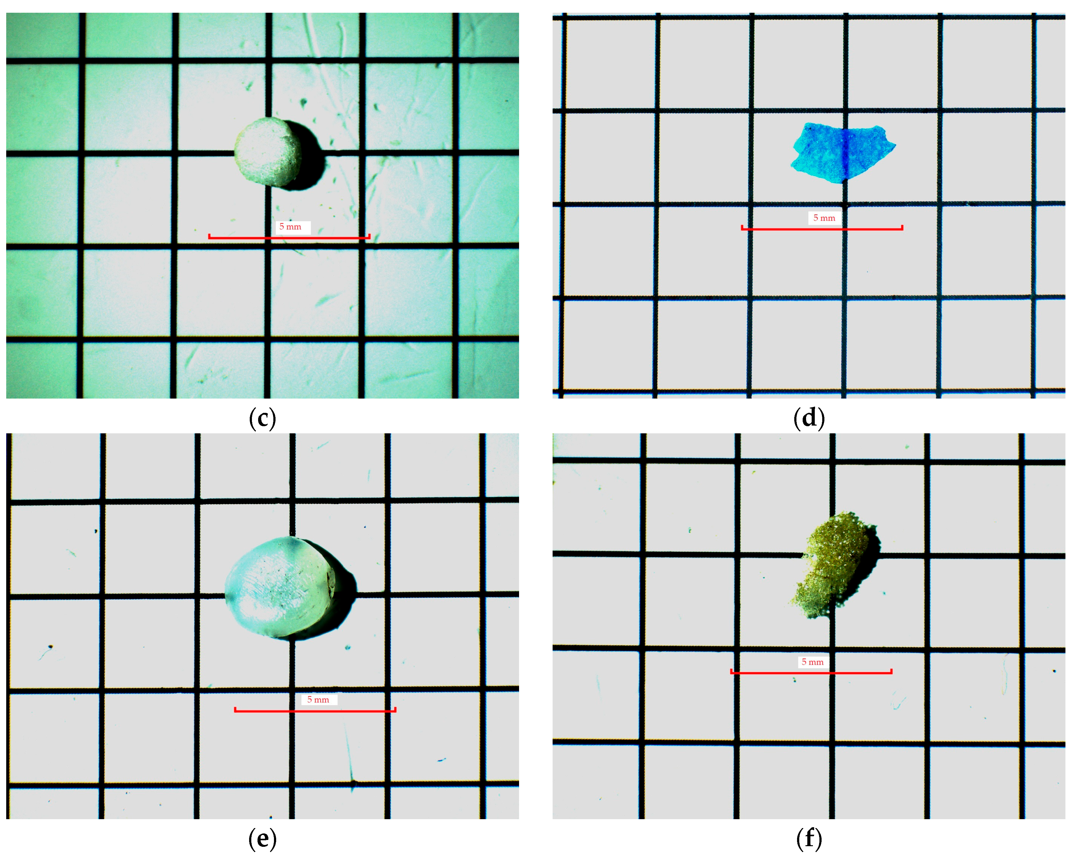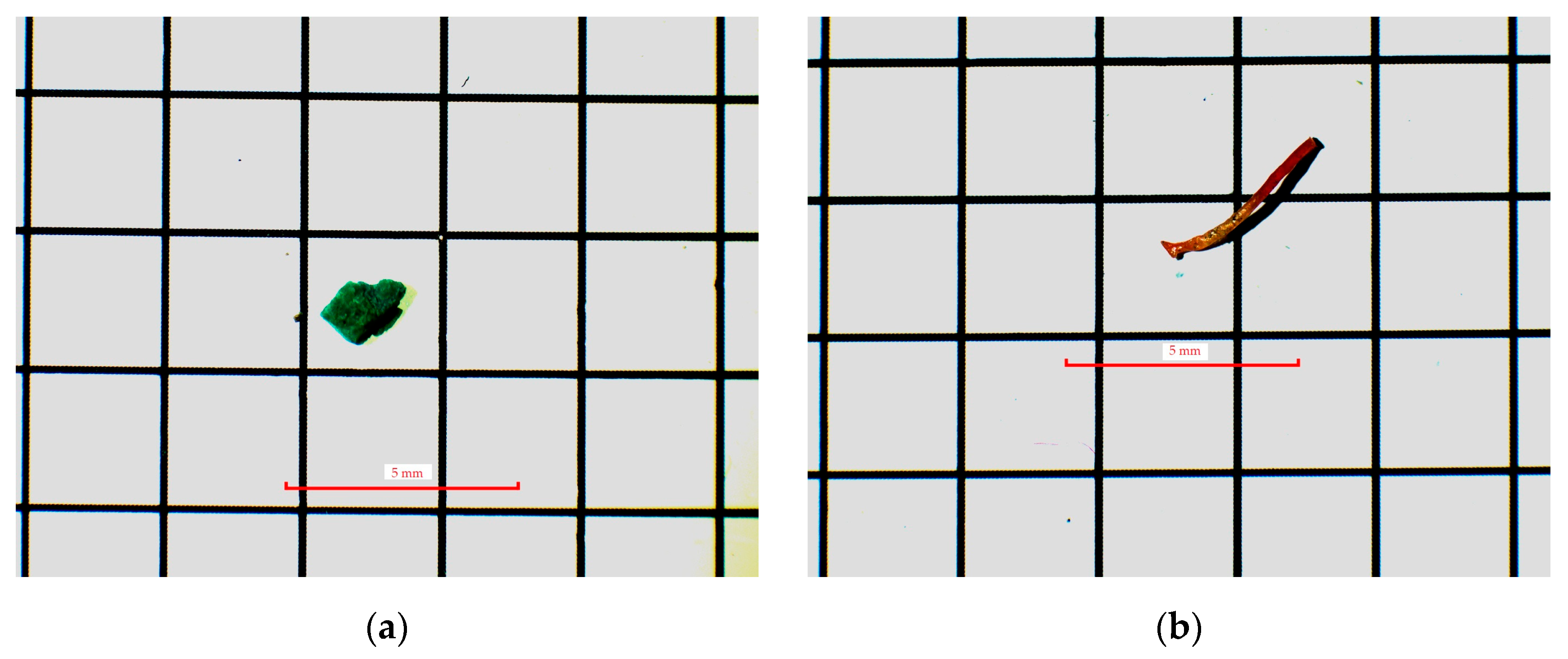 The plastic items were first visually inspected [44,54] (p. 203) for size, shape, and color under a Motic SMZ-171 (Motic, HongKong, China) stereomicroscope at 100× magnification. After separation from debris, all plastic samples were categorized and counted according to their shape, color, and polymer type.