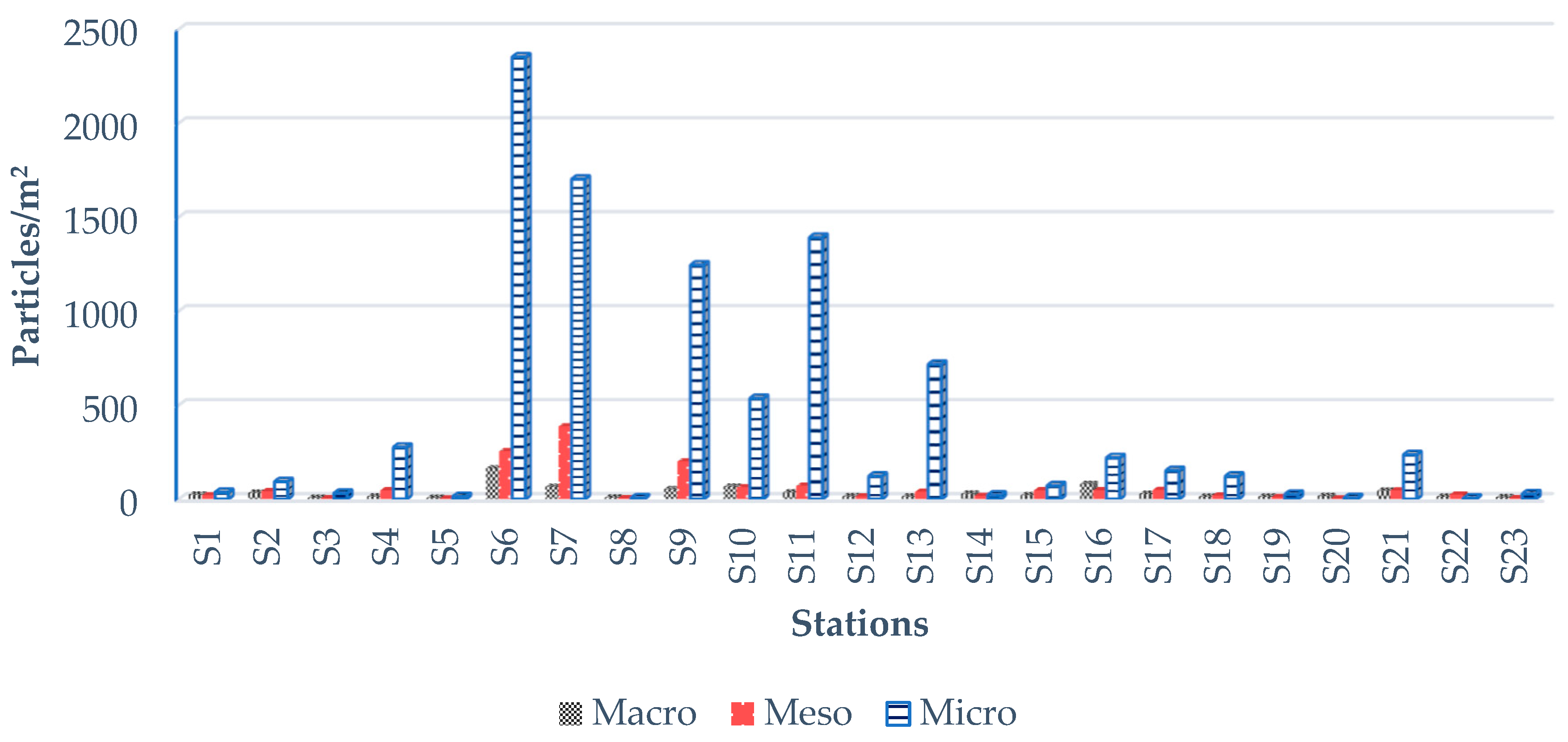 Table A2 (see Appendix A.2) summarizes the total particle counts, mean, SD, and range per station for micro-, meso-, and macroplastics across the three zones, providing a statistical overview of abundance and spatial variability.