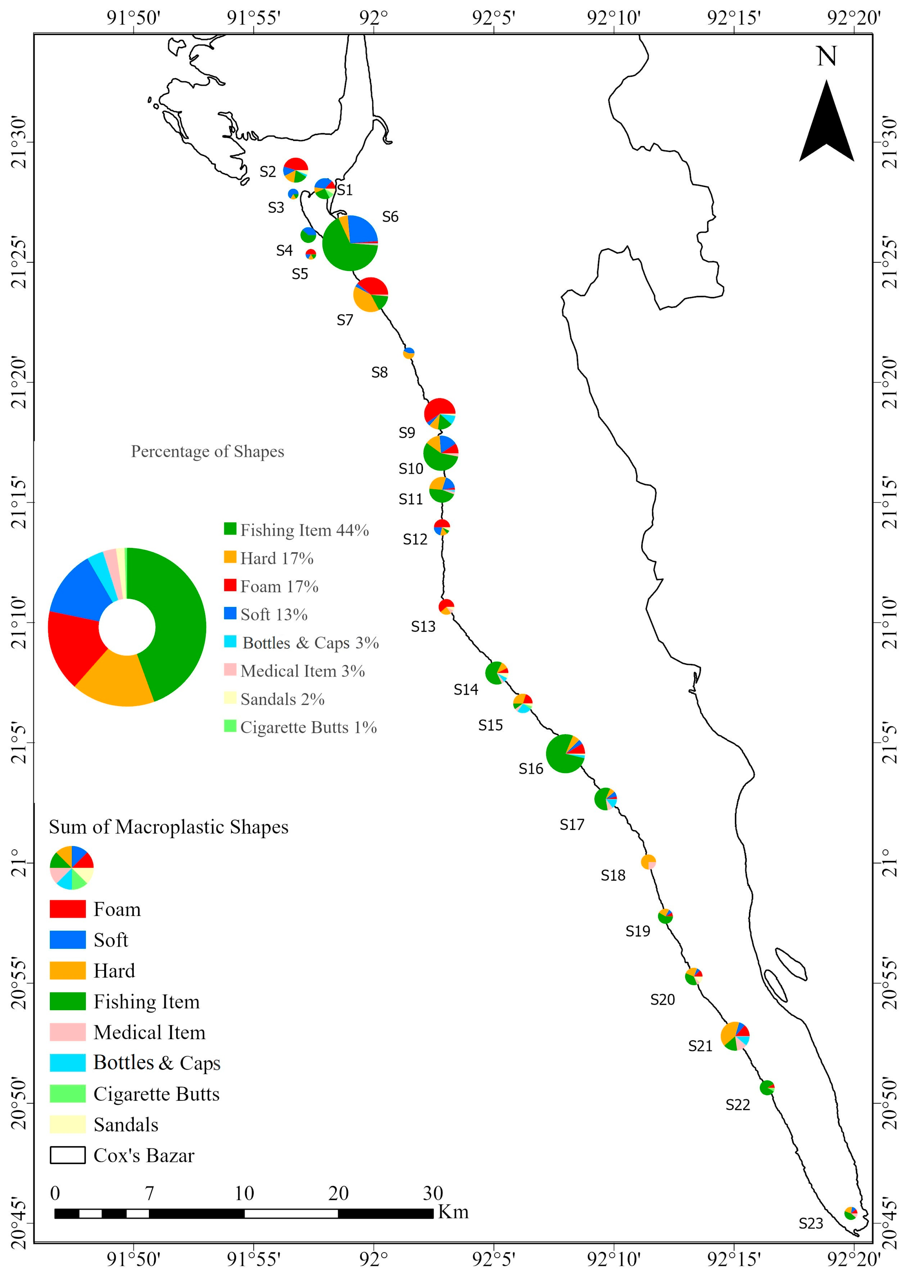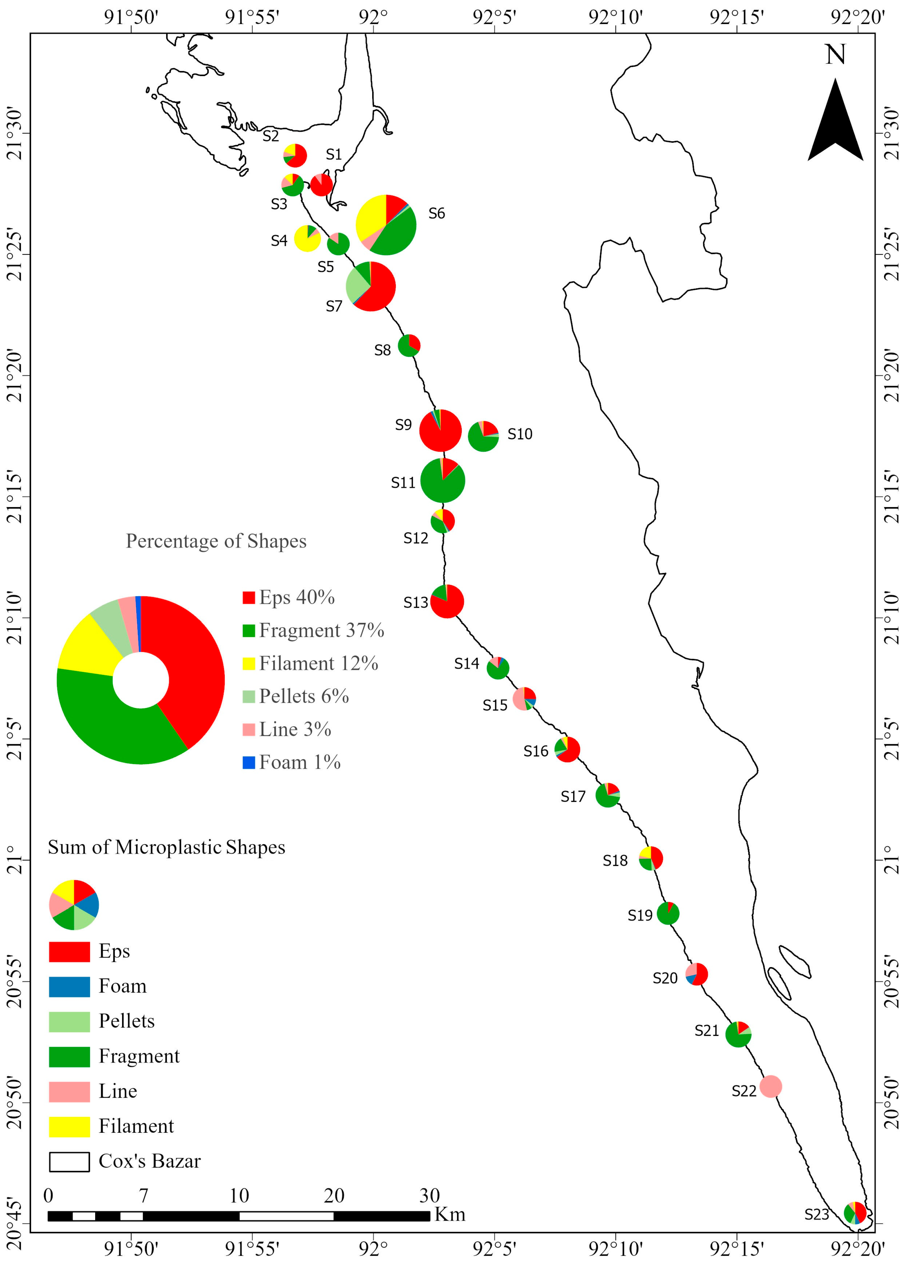 Recent studies in Cox’s Bazar beach sediments [37] found a mean abundance of 368.68 ± 10.65 items/kg, with fiber being the most common type (53%). Another study [45] found a much lower mean abundance of 8.1 ± 2.9 particles/kg, where fragments were most dominant. These differences in Rahman’s study are likely due to differences in sample collection methods.
