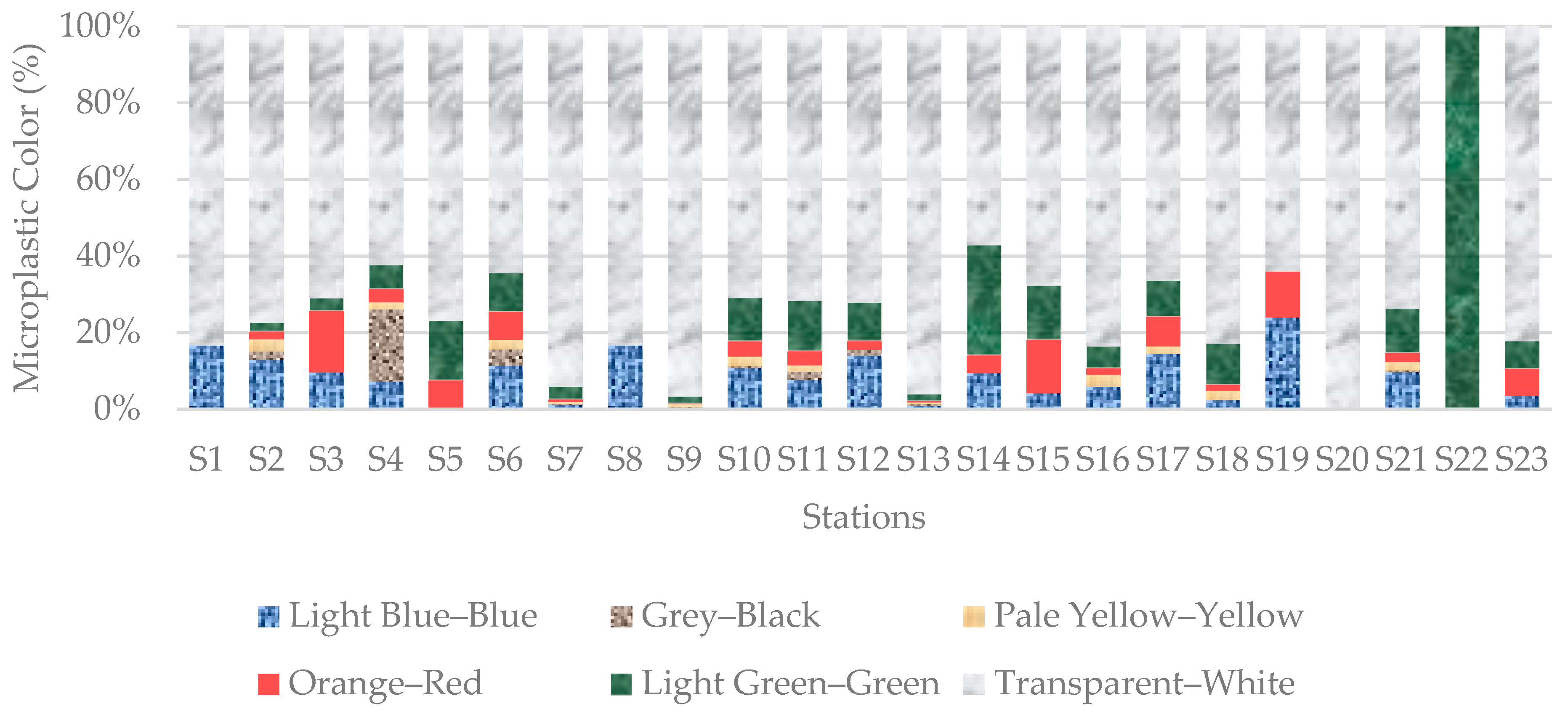 The Mp colors from beach sediments samples in order of abundance were transparent–white (7453 particles, 79.22%), light green–green (685 particles, 7.28%), light blue–blue (597 particles, 6.35%), orange–red (330 particles, 3.51%), grey–black (202 particles, 2.15%) and pale yellow–yellow (141 particles, 1.50%) (Figure 9).
