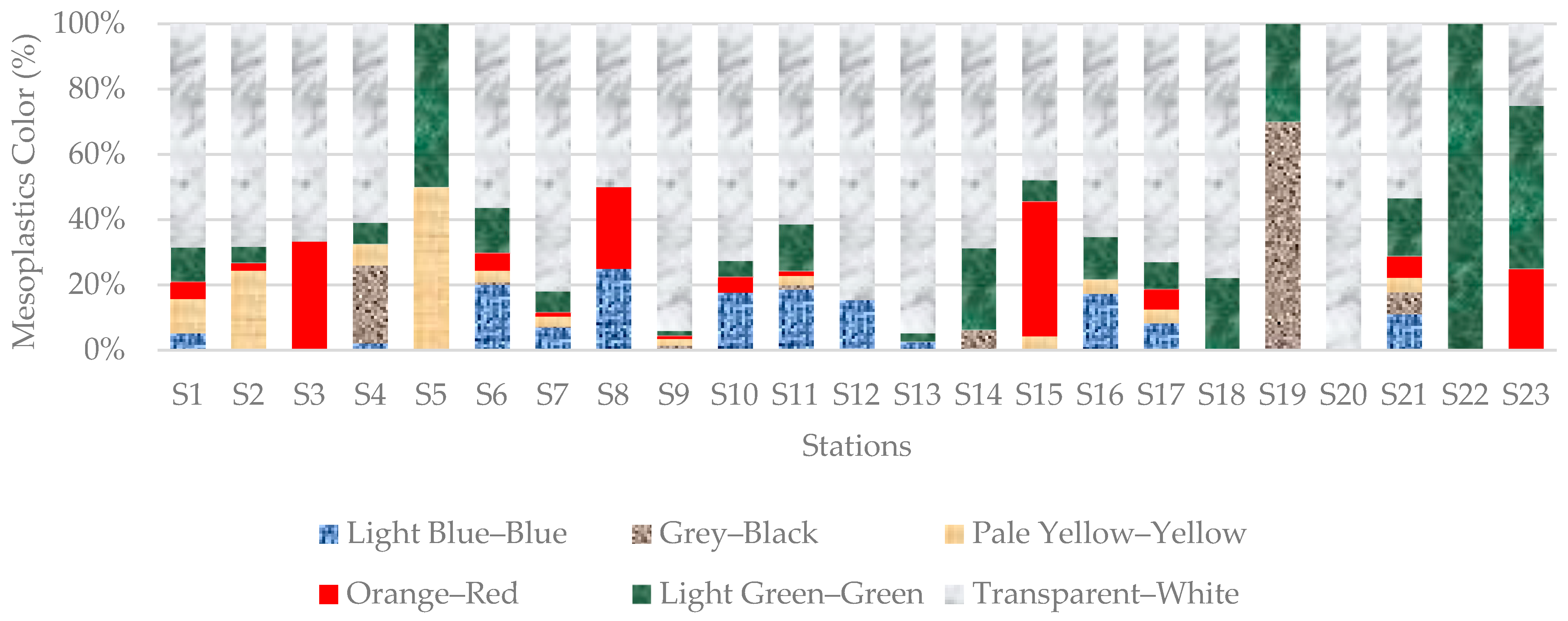 The mesoplastic colors from beach sediments samples in order of abundance were transparent–white (994 particles, 71.20%), light green–green (142 particles, 10.17%), light blue–blue (126 particles, 9.03%), orange–red (55 particles, 3.94%), pale yellow–yellow (51 particles, 3.65%) and grey–black (28 particles, 2.01%) (Figure 10). Color variations were not observed for macroplastics due to the presence of multiple colors in many items.