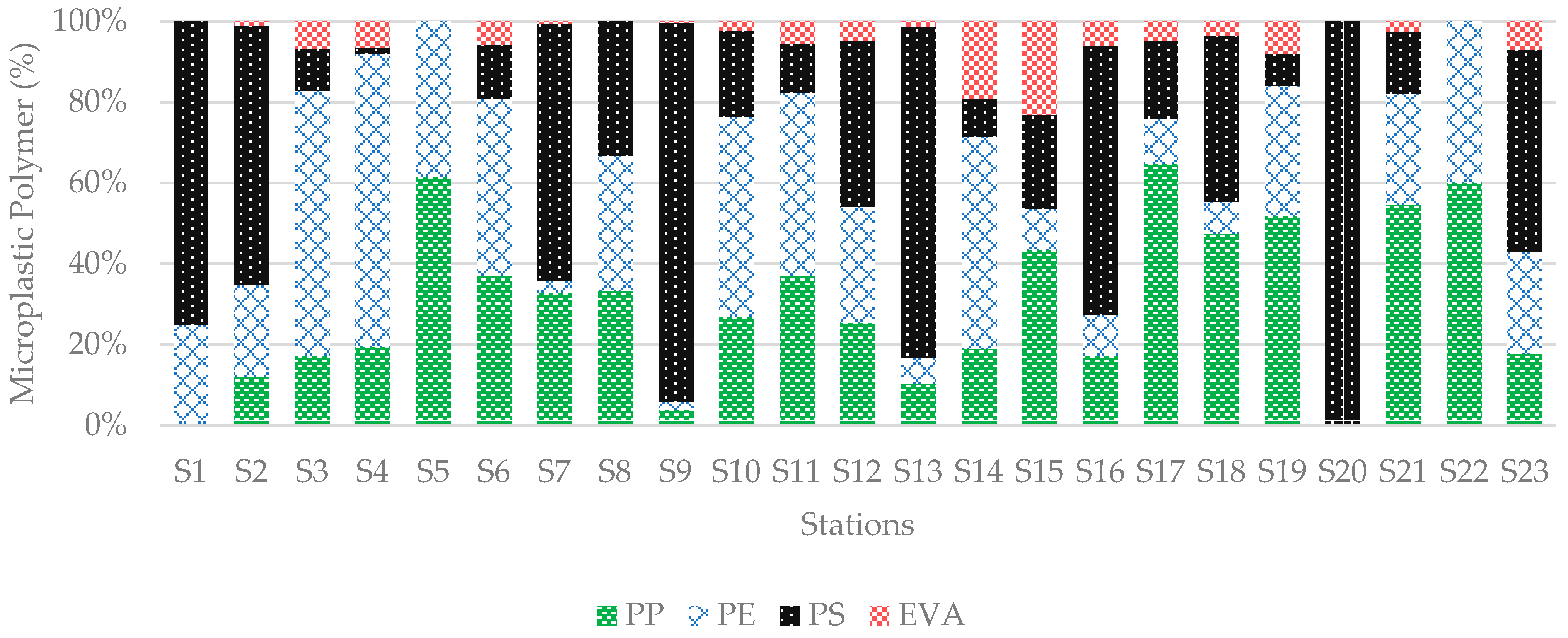 Figure 12. Distribution of mesoplastic polymers in sediment samples collected from all stations. PS was the dominant polymer, whereas PE and PP were present in relatively similar amounts.