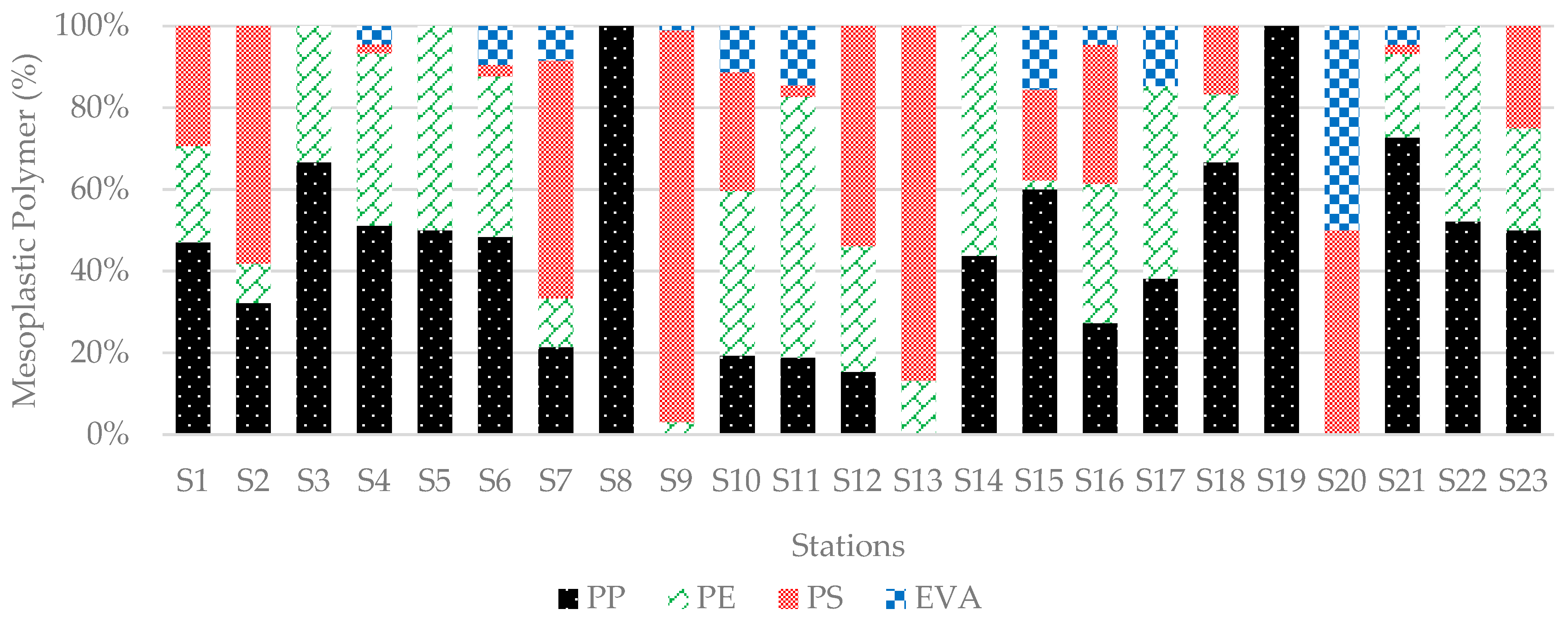 3.4. Polymer Types of Microplastics, Mesoplastics, and Macroplastics