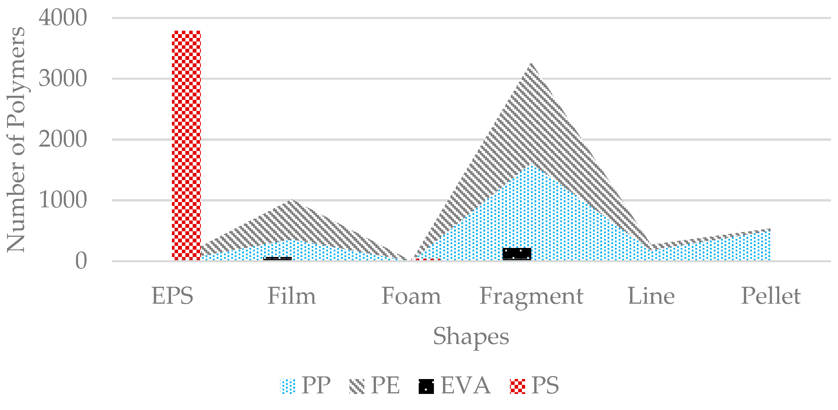 The PS number was highest in MPs due to the large number of EPS particles. All EPSs were PS-based (3788 particles) except for 12 particles found from ABS types, which are also styrene-based polymers. PP and PE were found in their highest number in fragment shapes at 1617 and 1652, respectively. In film shapes, the PE number was the most abundant (656 particles), as it represents soft plastic, especially polythene bags or food packing products. Most of the pellets represent (503 particles) PP types of polymers (Figure 13). PP was also the most abundant in the line shapes of plastics, which mainly represent ropes or fibers from fishing nets. Although the number of foams was very low, most of them represented PS (43 particles) and PU (40 particles).