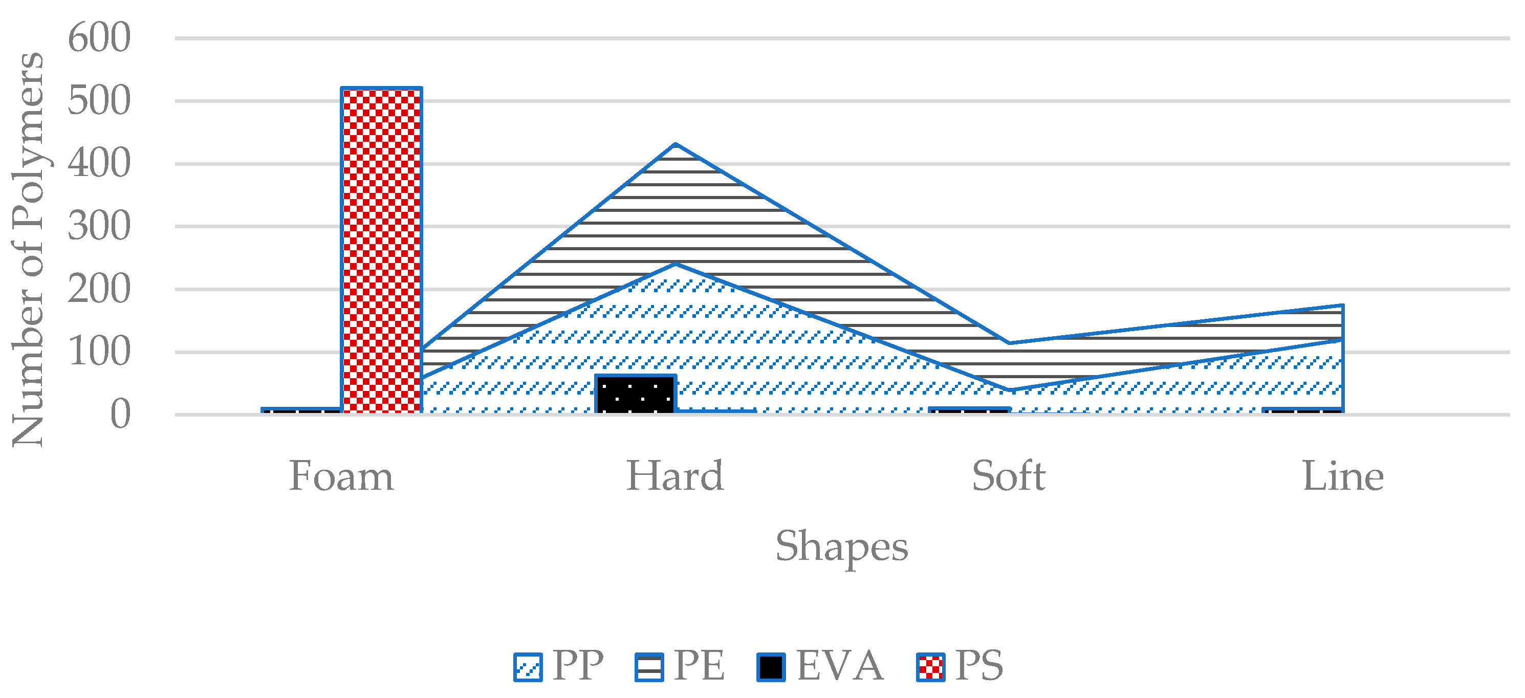 PS was also the most abundant mesoplastic due to the high number of foams found in the mesoplastics. All foams were PS-based polymer (521 particles) except for 10 particles found from EVA types and 2 particles from PP types. In mesoplastics, all EPSs were considered in the foam category. PP and PE were highest in number in the hard plastic group, at 242 and 191, respectively. In soft plastics, PE was the most abundant (75 particles), as it represents polythene bags or food packing products. PP was the most abundant in line-shaped plastics, mainly representing ropes or fibers from fishing nets (Figure 14).