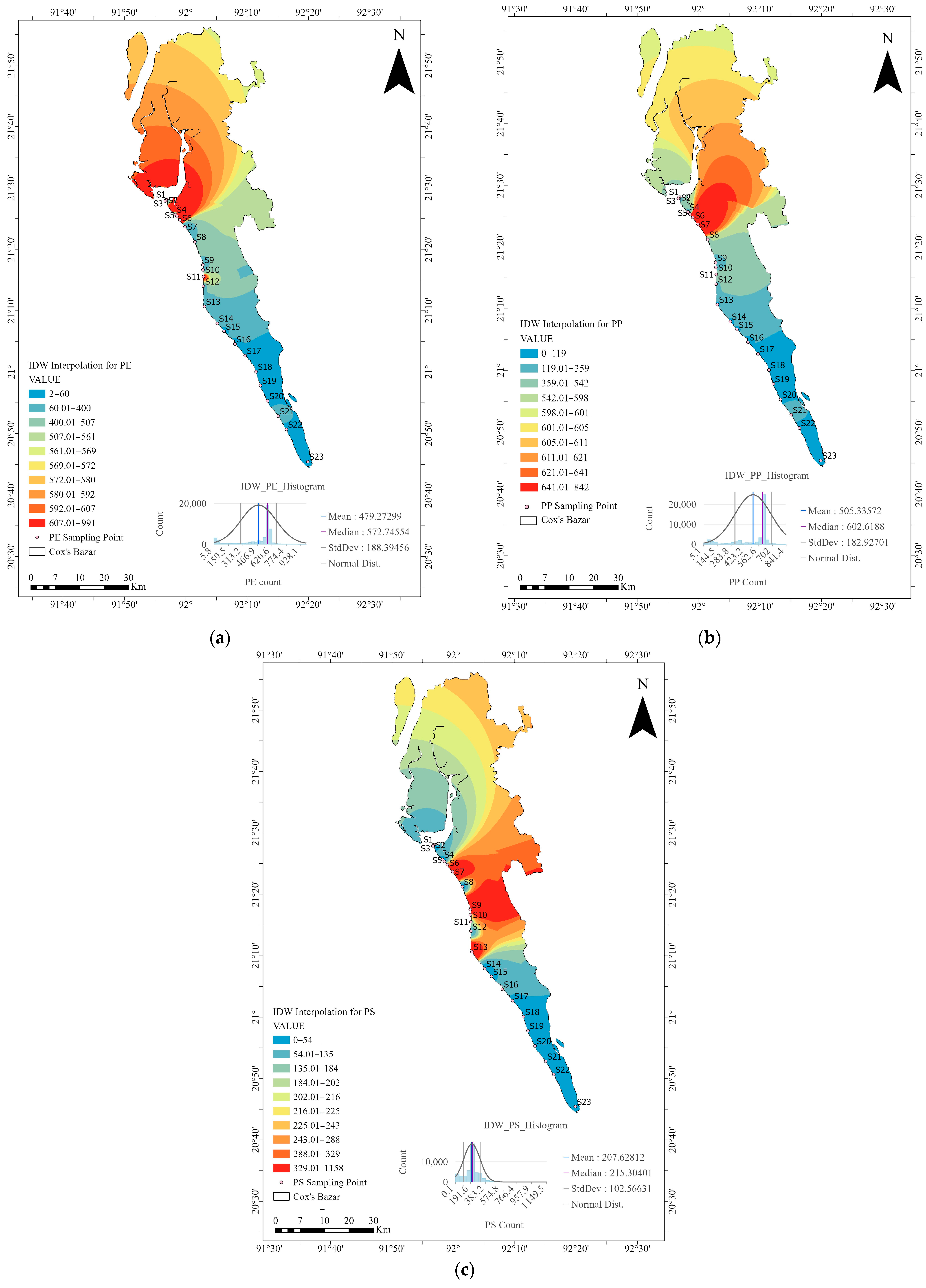 Figure 15. Spatial distribution of microplastic polymers in Cox’s Bazar using IDW interpolation: (a) PE, (b) PP, and (c) PS. The red zones indicate areas of the highest concentration of PE around the Maheshkhali Channel, and of PP and PS in the urban and industrial areas of Cox’s Bazar. The histograms show the mean, median, and standard deviation of the IDW-interpolated values for each polymer.