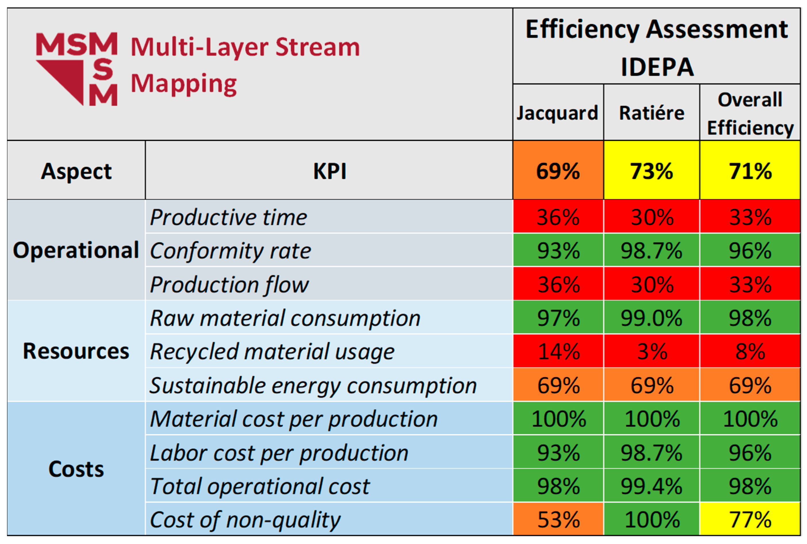 Figure 1 illustrates an example of the structure of the MSM tool, showing process steps at the top line and KPIs in the first column. The results are presented in terms of efficiency [