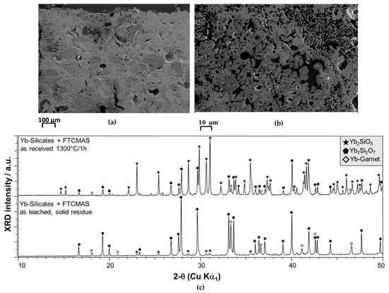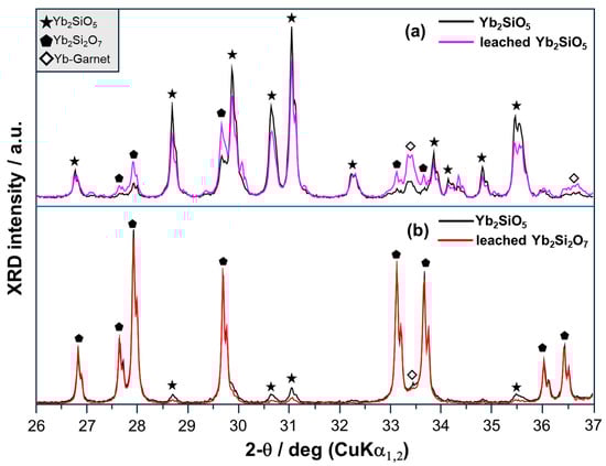 SEM microstructures of lab-duplicated EOL coatings in Figure 3a,b provide an overview of CMAS corroded Yb2SiO5 and Yb2Si2O7, respectively. The distinct appearance of solid residues of both coatings in Figure 3c,d, supports the concept of selectivity of sulfuric acid leaching for Yb2SiO5. Solid residue of Yb2SiO5 exhibits a heavily attacked and structurally degraded morphology, due to high leaching efficiencies. On the other hand, the dense and unaffected image of Yb2Si2O7 residue proves a less efficient leaching process. A deeper insight is provided by detailed XRD profiles of both materials as plotted in Figure 4. Evidently, the peak intensity ratio between Yb2SiO5 (star tickmarks) and Yb2Si2O7 (pentagon tickmarks) in the Yb2SiO5 sample (a, black curve) has shifted significantly towards Yb2Si2O7 in the leached Yb2SiO5 sample (a, magenta curve): peak intensities of Yb2SiO5 significantly decrease after leaching while Yb2Si2O7 is relatively increasing; a similar trend is observed for Yb-garnet (diamond tickmarks). In contrast, the leached Yb2Si2O7 sample (b, magenta line) does not show significantly changing Yb2Si2O7 peak intensities with respect to unleached Yb2Si2O7; (b, black line and pentagon tickmarks). However, even the minor, co-existing Yb2SiO5 phase shows a similar trend; i.e., decreasing intensities after leaching (b, star tickmarks). Thus, XRD analyses of unleached and leached Yb-silicates confirm the high leaching selectivity of Yb2SiO5 in comparison with Yb2Si2O7 and Yb-garnets.