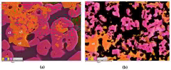 Figure 2 represents the EDS mappings of two aforementioned distinct regions of solid leach residue; point EDS analysis in Table 1 reveals the stoichiometry of distinct phases labeled in Figure 2. In both regions, a dominant remaining phase, which is labeled in a pink color (#3, #5), is corresponding to Yb-garnet. Beside Yb-garnet, light orange-colored grains are abundant in solid residue, which correspond to Yb2Si2O7 as revealed by point EDS analyses (#2, #4). In parallel with the XRD findings, EDS mapping of the solid residue point out that Yb-garnet and Yb2Si2O7 phases remain undissolved after sulfuric acid leaching. Moreover, small amounts of Yb2SiO5 detected in XRD analysis were also displayed as dark orange-colored grains Yb2SiO5 (#1). Mappings uncovered that remaining Yb2SiO5 grains are encapsulated in Yb-garnet and Yb2Si2O7 with no free and accessible surfaces, which prevents the access of leaching medium. In the light of these initial XRD and SEM/EDS findings, it is plausible that sulfuric acid leaching is selective and efficient for Yb2SiO5.