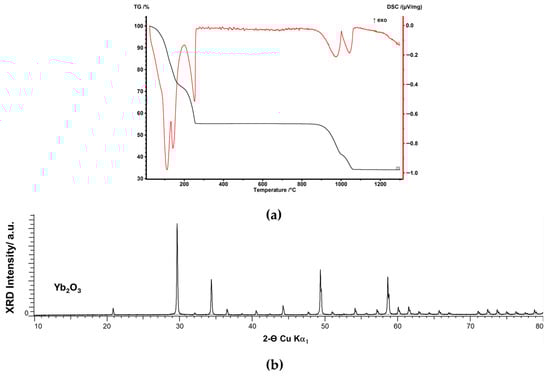 Thermal analysis indicates that upon heating with 5/min rate in air, this leachate undergoes several endothermic reactions, resulting in almost 50% weight loss. As mentioned previously, Yb should be dissolved in sulfuric acid and forms Yb sulfates. DSC and TGA signals point out that product undergoes several endothermic reactions, matching very well with this is ytterbium (III) sulfate octahydrate Yb2(SO4)3·8H2O as previously reported [17]. The weight loss that readily starts upon heating at lower temperatures is due to the dehydration of crystal octahydrate. Reactions taking place at higher temperatures (~800 °C) may be due to the stepwise decomposition into metal sulphate hydrate, anhydrous metal sulphate, basic metal sulphate or metal oxide, as previously reported [17]. After 1050 °C, mass loss reaches a steady state, indicating the termination of the Yb2O3 formation sequence; in agreement with the XRD analysis given in Figure 5. Thus, it can be stated that significant amounts of phase-pure Yb2O3 can be recovered from pregnant leach liquors by a simple extraction of precipitated Yb2(SO4)3·8H2O and subsequent thermal treatment.