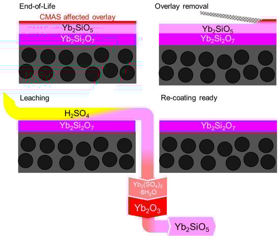 Multilayer EBCs comprising Yb2SiO5 top layer and Yb2Si2O7 bottom layer have been investigated and declared as a superior alternative, bringing together the high water-vapor corrosion resistance of Yb2SiO5 and the thermal/mechanical compatibility of Yb2Si2O7 to both top-coat and SiC base material. Relatively lower silica activity of Yb2SiO5 provides excellent resilience against water vapor corrosion and acts as a protection layer covering inner Yb2Si2O7 regions, which provides enhanced crack propagation resistance and associated oxidation protection for SiC [34,35]. This design, which aims to enhance corrosion and mechanical properties, remarkably also favors a new repair/overhaul concept. As revealed in this study, it is possible to solve Yb2SiO5 selectively and recover high amounts of Yb through sulfuric acid leaching. As proposed in Figure 8, the Yb2SiO5 top layer may be used as a Yb-secondary resource. After service life, CMAS-affected overlays with residual CMAS and chemically stable reaction products like apatite or garnet may be removed mechanically, i.e., by grit blasting. Subsequently the Yb2SiO5 top layer may be removed by sulfuric acid treatment. Thanks to the multilayer design, the H2SO4-stable Yb2Si2O7 layer can remain on top of the SiC base material and could be coated again with a Yb2SiO5 top coat. It must be emphasized, however, that in a technological approach of SiC and some SiO2 formed during operation of the ceramic matrix composites presumably will be partially exposed to H2SO4. However, with exception of hydrofluoric acid, both Si-phases can be considered stable vs. attack of aqueous acids. Moreover, leaching experiments in this study were performed on powders after mixing and crushing of the entire system, i.e., including the CMAS-affected overlay. An efficient transfer concept will be considered to achieve the same extraction efficiencies, where acid is sprayed onto the coating and where acid and leachate have different interaction volumes. In any case, either Yb-based compounds may be precipitated through solvent extraction or phase pure Yb2O3 can be recovered through thermal treatment.