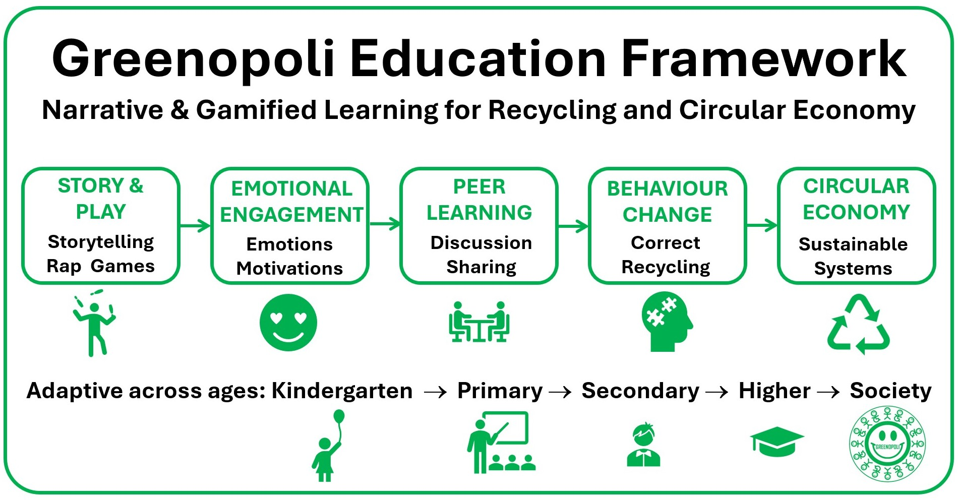 This paper presents the Greenopoli framework in detail, discussing its contents, methods, and adaptation to different age groups. It examines Greenopoli long-term implementation in diverse educational settings and reflects on its educational outcomes and learning-related effects through qualitative observations and selected quantitative evidence. By highlighting Greenopoli distinctive features, such as peer-to-peer learning, gamified activities, and creative storytelling (including “green raps”), the current paper illustrates how this method contributes to recycling education and communication in support of a circular economy. The strengths of the Greenopoli experience and the lessons learned are discussed as potential inputs for future educational initiatives and policy-oriented actions aiming to bridge the gap between environmental education theory and practice.