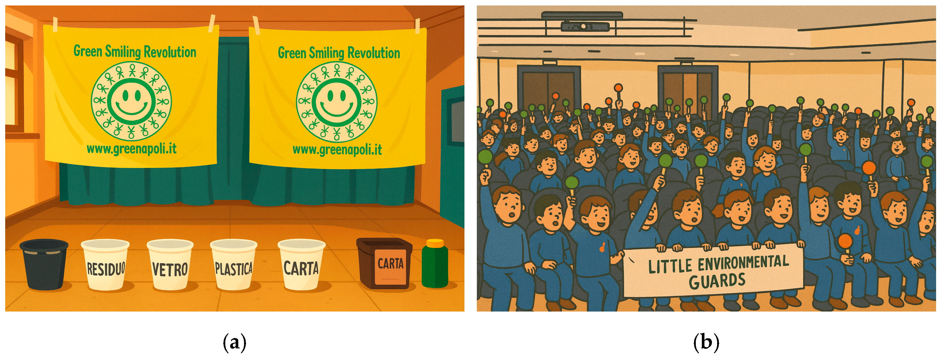 Figure 3b). For example, they might draw a big faucet on one cardboard sign to remind everyone to turn off taps. The act of making these signs from waste cardboard itself teaches creative reuse (upcycling). Once the Little Environmental Guards have learned the “rules of the game,” they are encouraged to enforce them at home: reminding parents to recycle according to the local collection calendar, to turn off lights, and so forth. In practice, this transforms children into influencers of adult behavior. This is a clear embodiment of the peer-to-peer and intergenerational learning that Greenopoli champions. Many families report that their children, acting as Greenopoli guards, become diligent “monitors” of household recycling, often correcting the adults if they sort waste incorrectly.