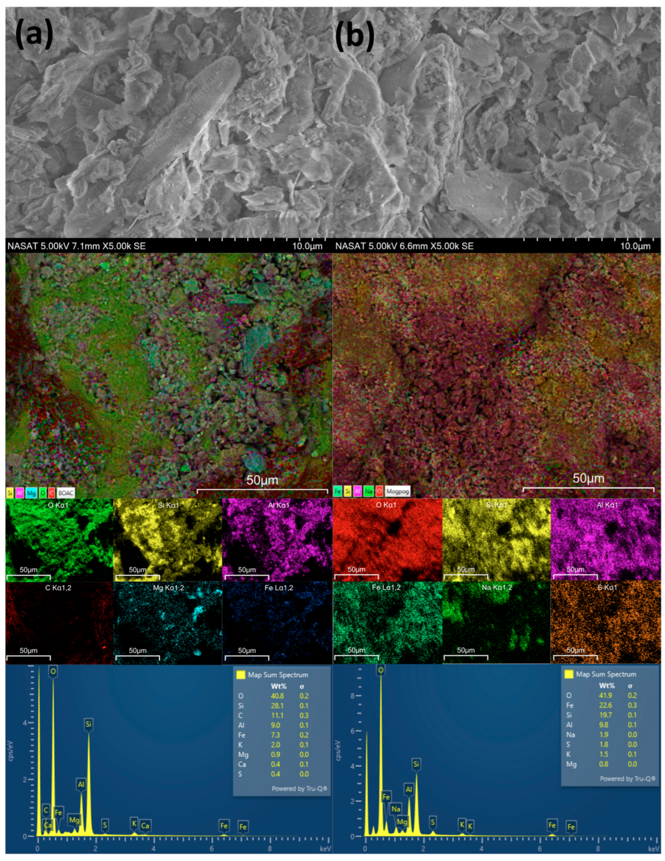 Figure 1 shows the surface morphology and elemental analysis of the as-received copper mine tailings and silt samples using scanning electron microscopy (SEM) coupled with energy-dispersive X-ray spectroscopy (EDX). The SEM images show that the tailings and silt particles from the Boac and Mogpog Rivers exhibit platy and irregularly shaped morphologies with some well-defined edges and faces. There is no significant difference in the surface morphology between the two samples.