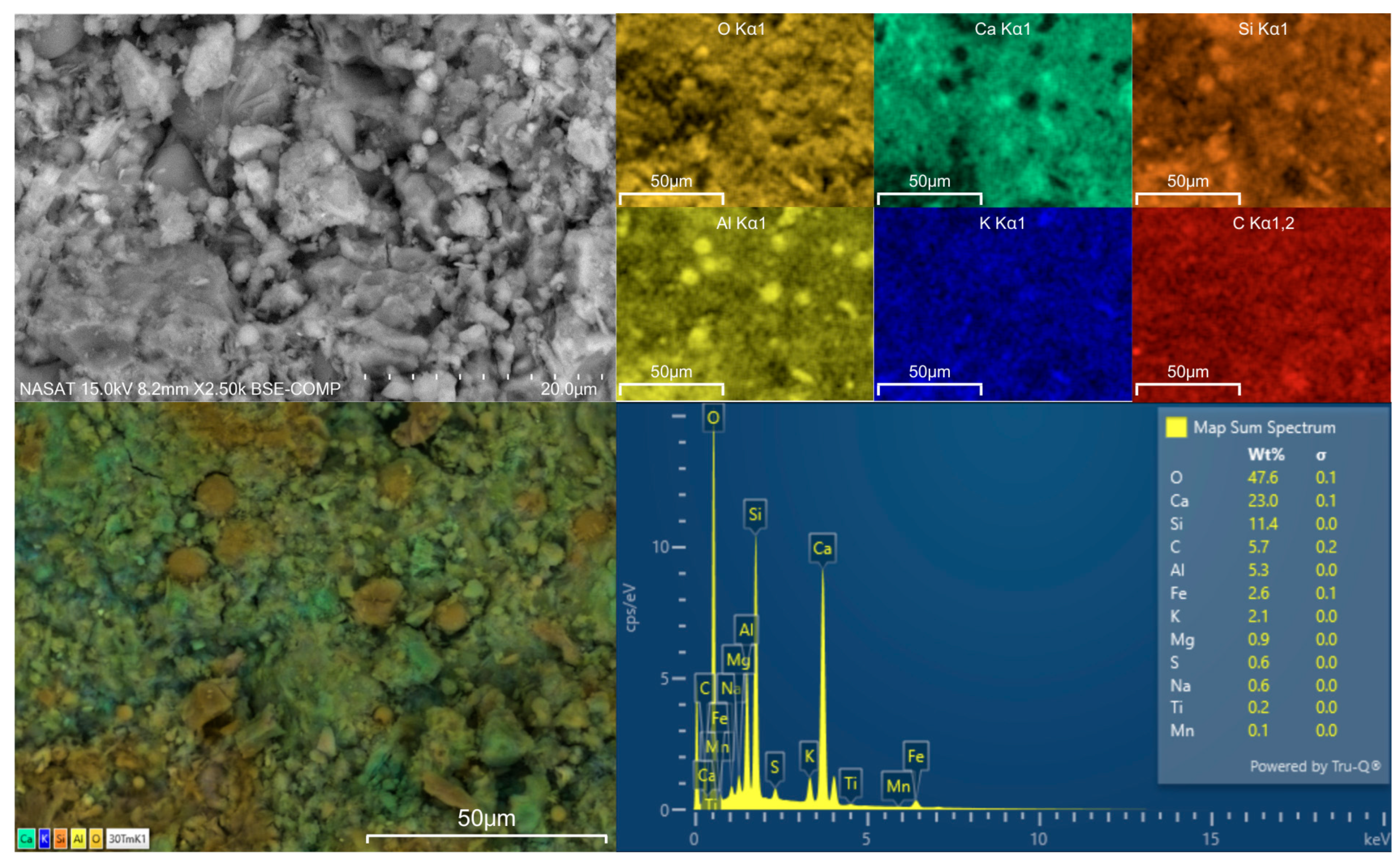 The presence of this cement paste surrounding the mineral particles as well as the inclusion of the alite and belite minerals suggests hydration reactions and indicates a mixture between the tailings and the cement, with the binder creating a cohesive matrix within the geopolymer-cement composite.