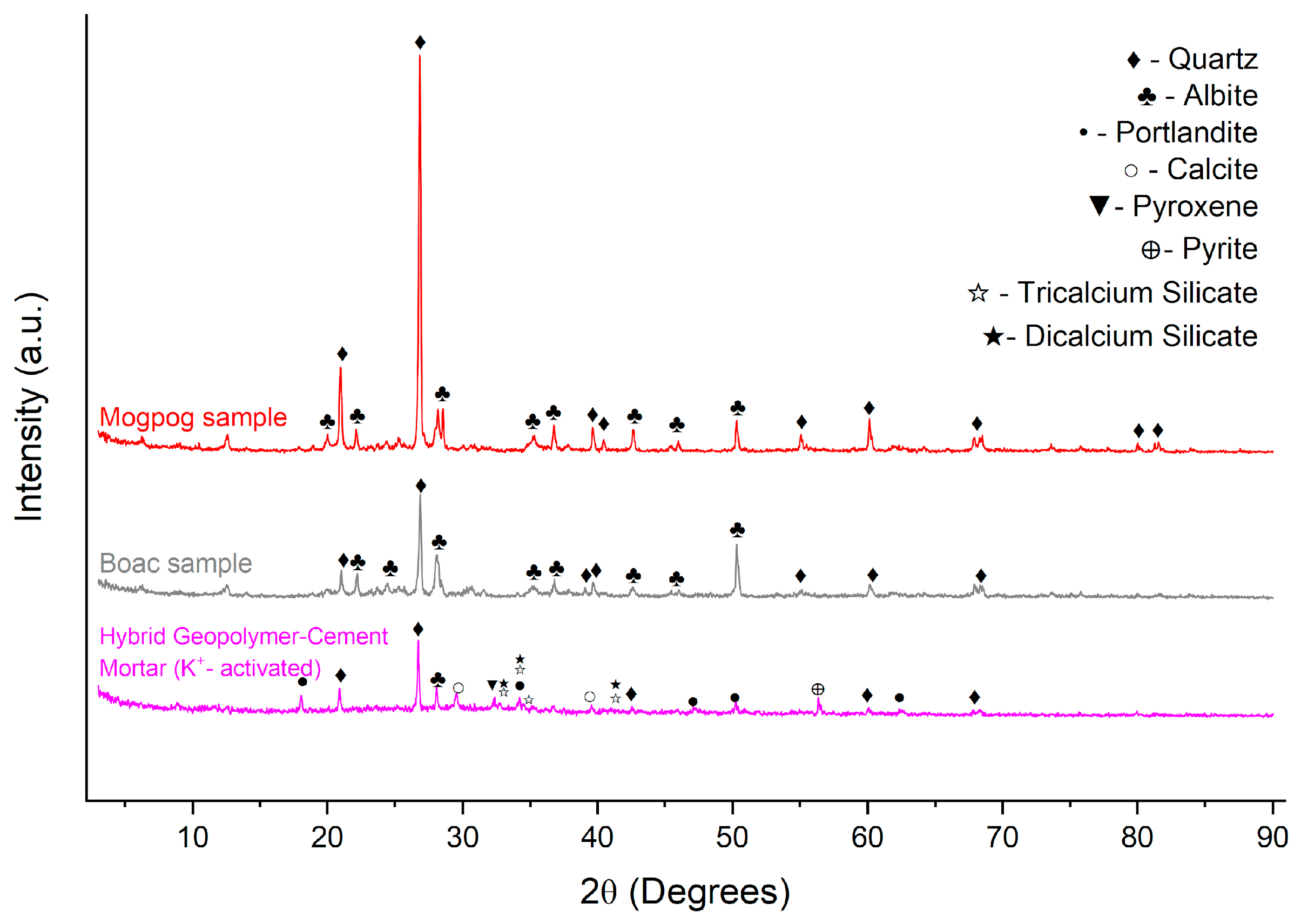 2) while Mogpog sediment sample comprises 62.5% albite and 37.5% quartz. These two main components are aluminosilicate precursors that can undergo geopolymerization reaction via alkali activation.